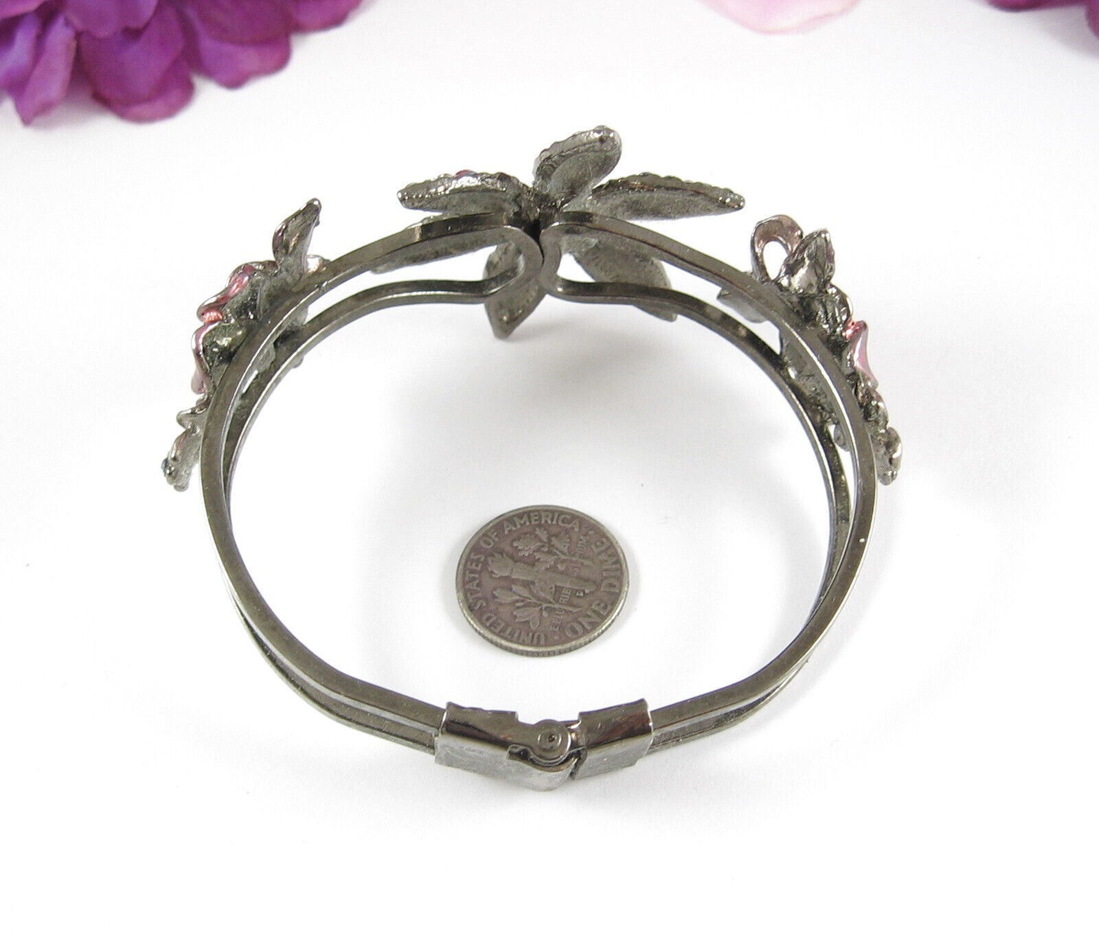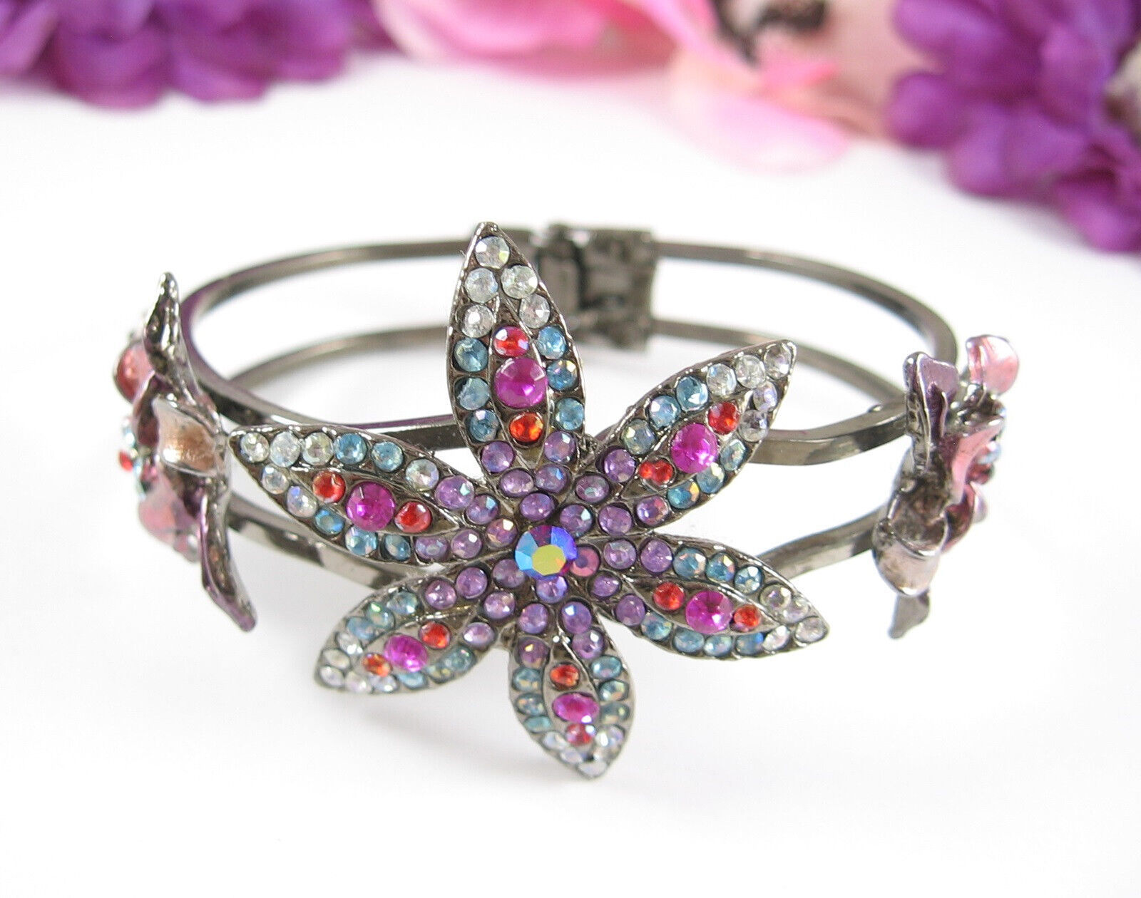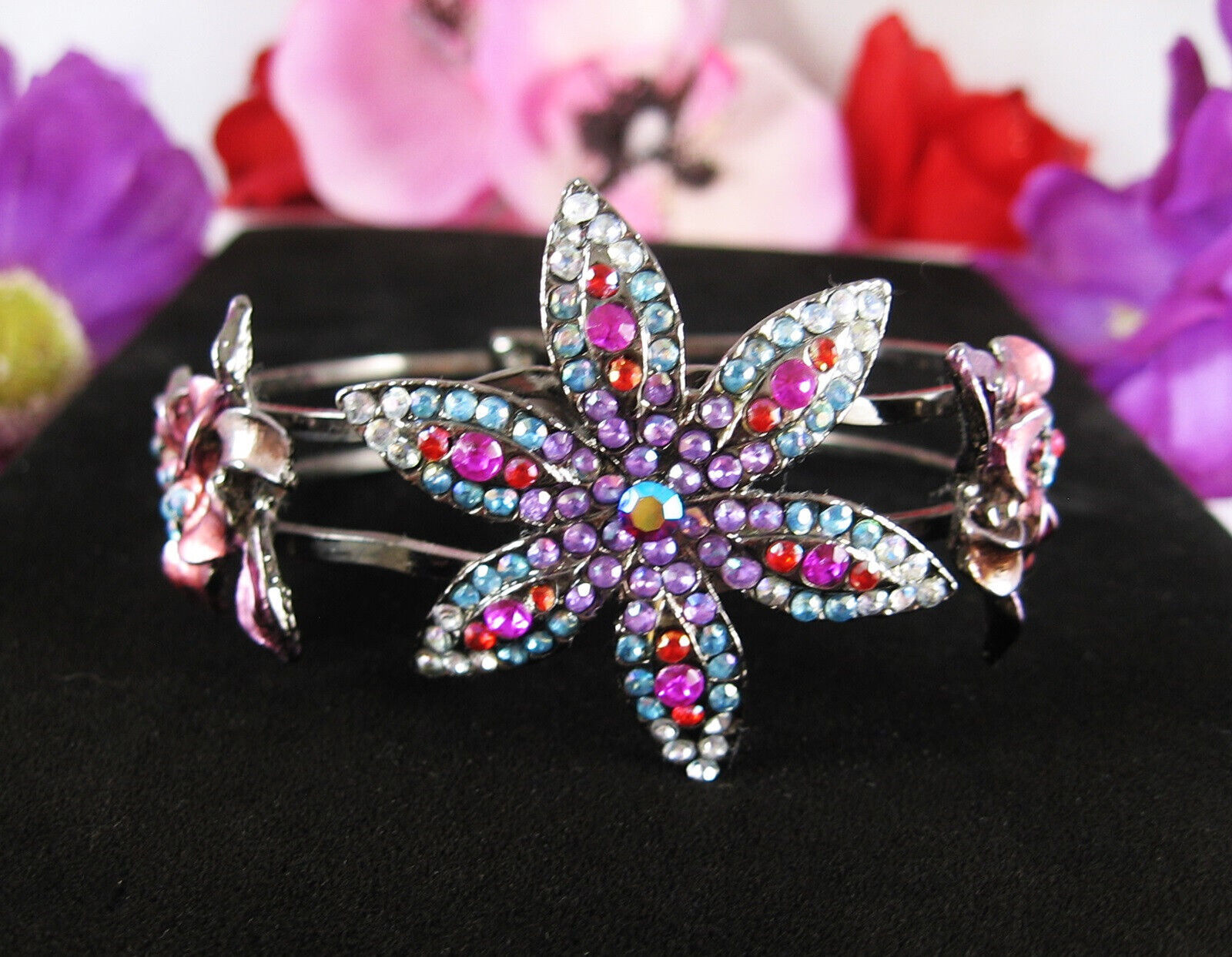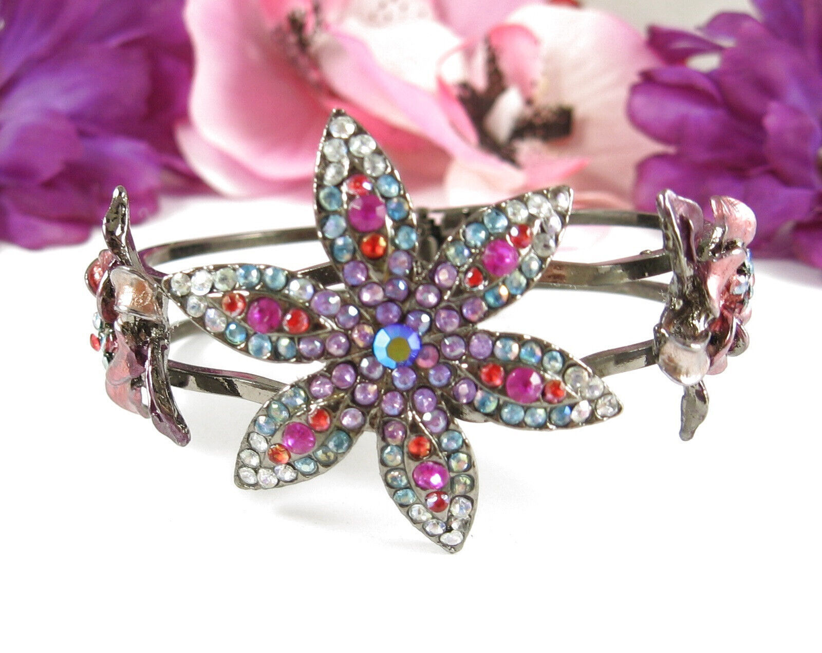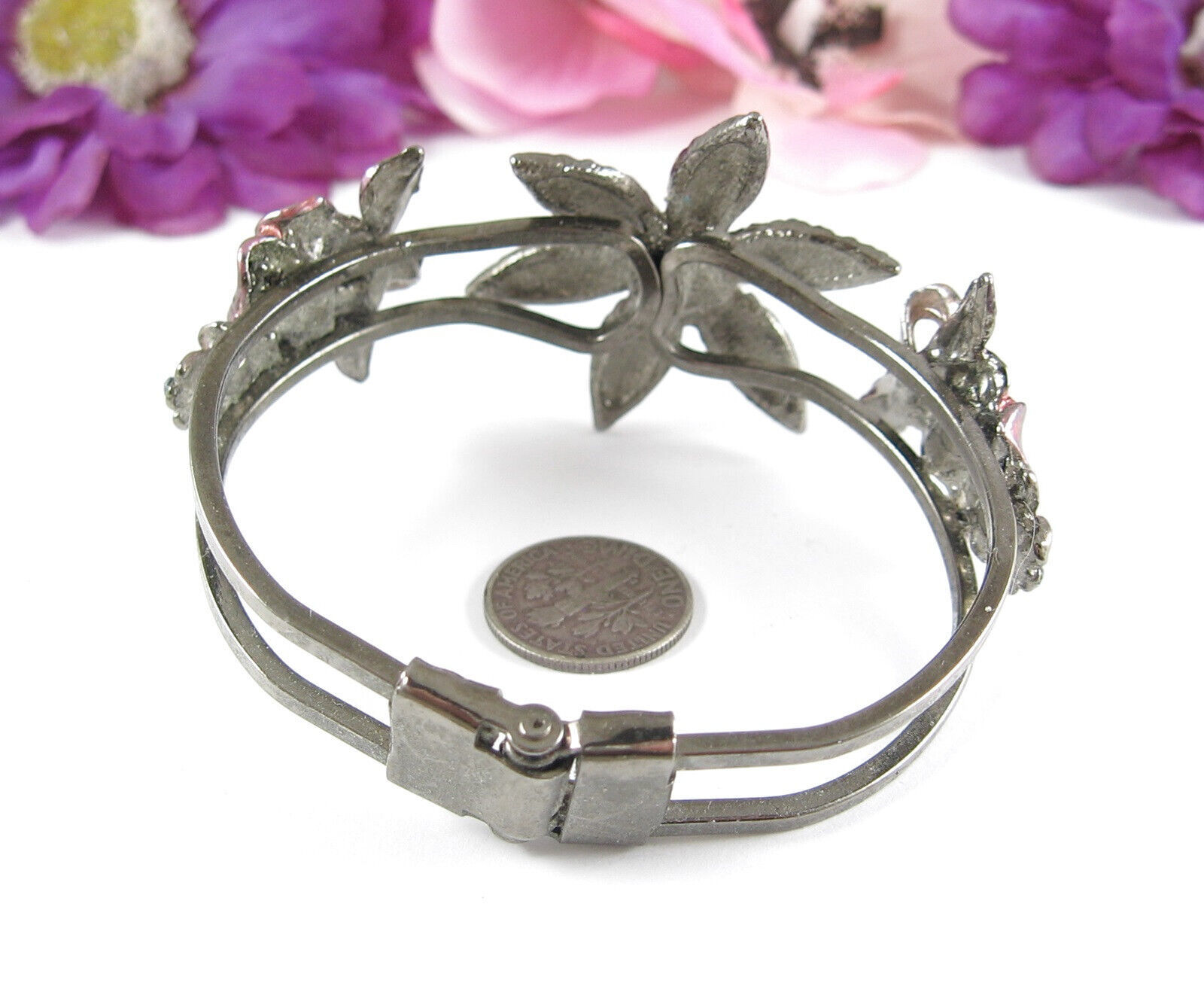Color RHINESTONE CLAMPER BRACELET Vintage Flowers Pink Purple Gunmetal Gray