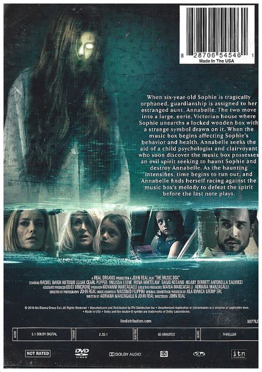 Plot: When six-year-old Sophie is tragically orphaned guardianship is assigned to her estranged aunt Annabelle. The two move into a large, eerie, Victorian house where Sophie unearths a locked wooden box with a strange symbol drawn on it. Desperate to connect with her niece Annabelle pries the lock open revealing a beautiful music box. Each time the music box is wound and replayed it's surprisingly chilling melody plays slightly longer, captivating Sophie even more. When the music box begins affecting Sophie's behavior and health Annabelle seeks the aid of a child psychologist and clairvoyant who soon discover the music box is possessed by an evil spirit who seeks to haunt Sophie and destroy Annabelle. As the haunting intensifies time begins to run out and Annabelle finds herself racing against the music box's melody to defeat the spirit before the last note plays. 091023-091023T-DVD11