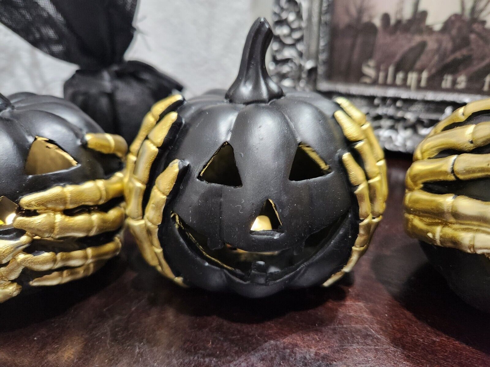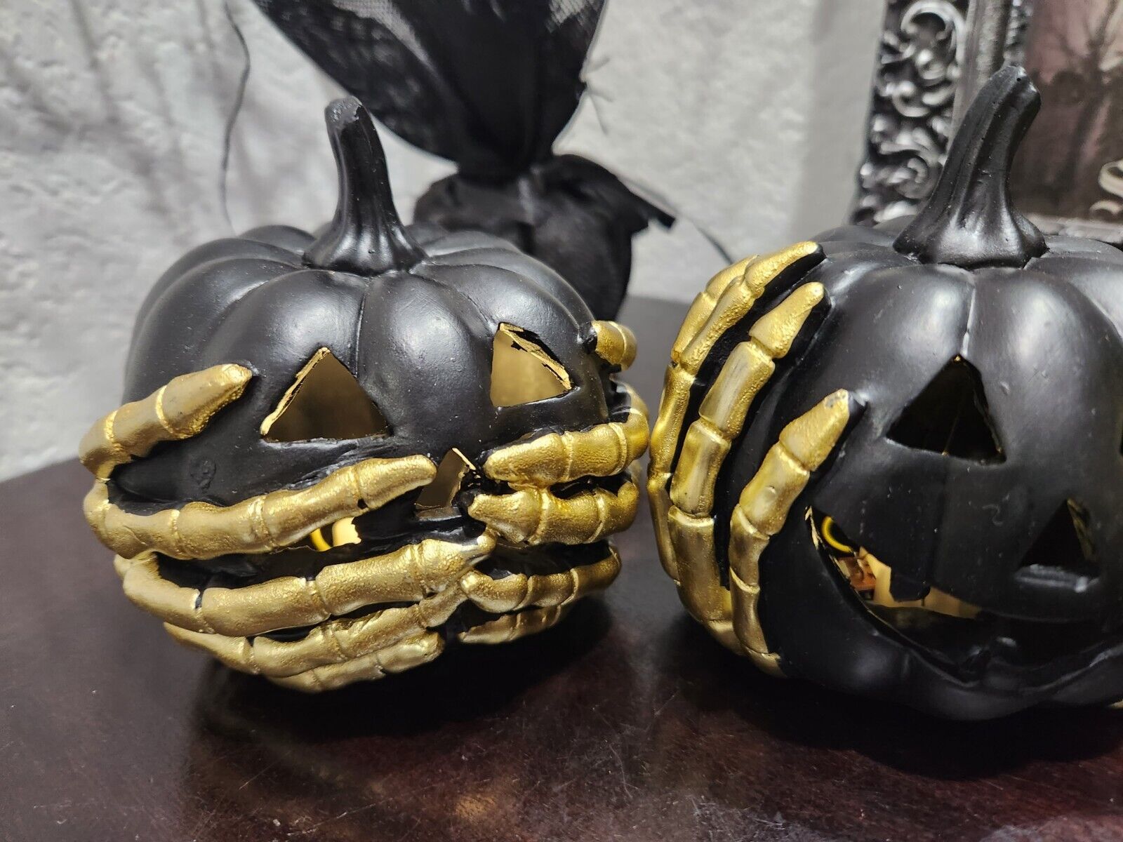Up for sale is these adorable pumpkins that light up. The pumpkins are made of resin and they have creepy gold hands on them. These measure approx 4" tall x 4.25" wide. These look amazing on a tier tray or any tabletop. NEW