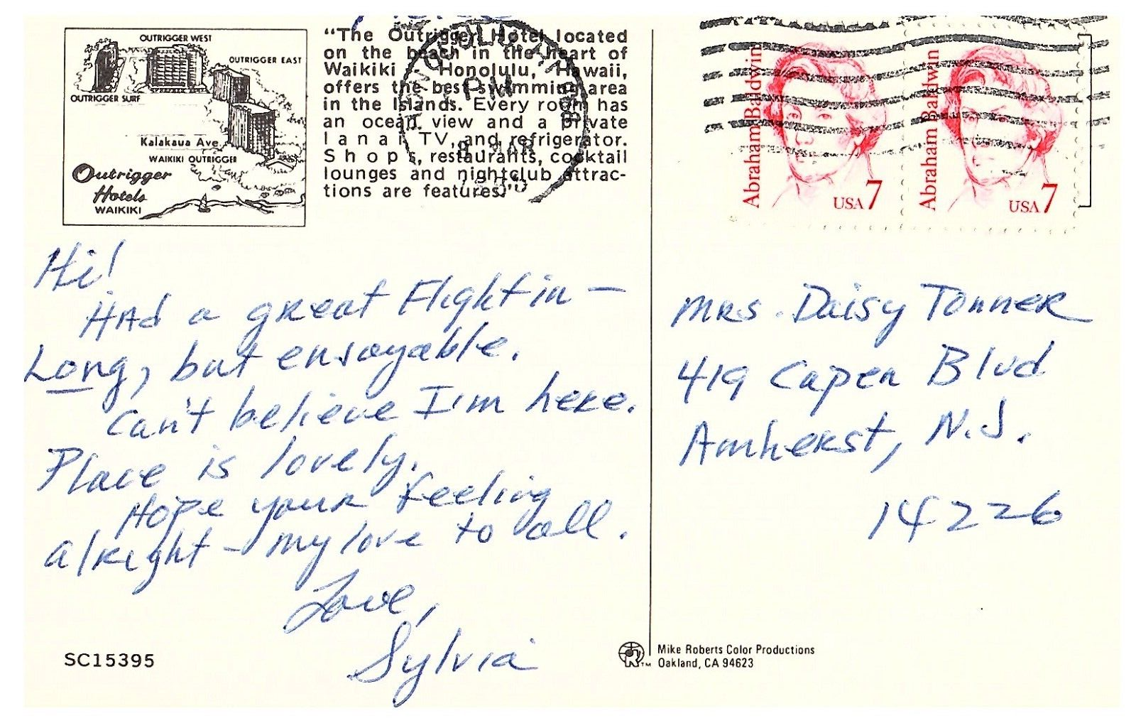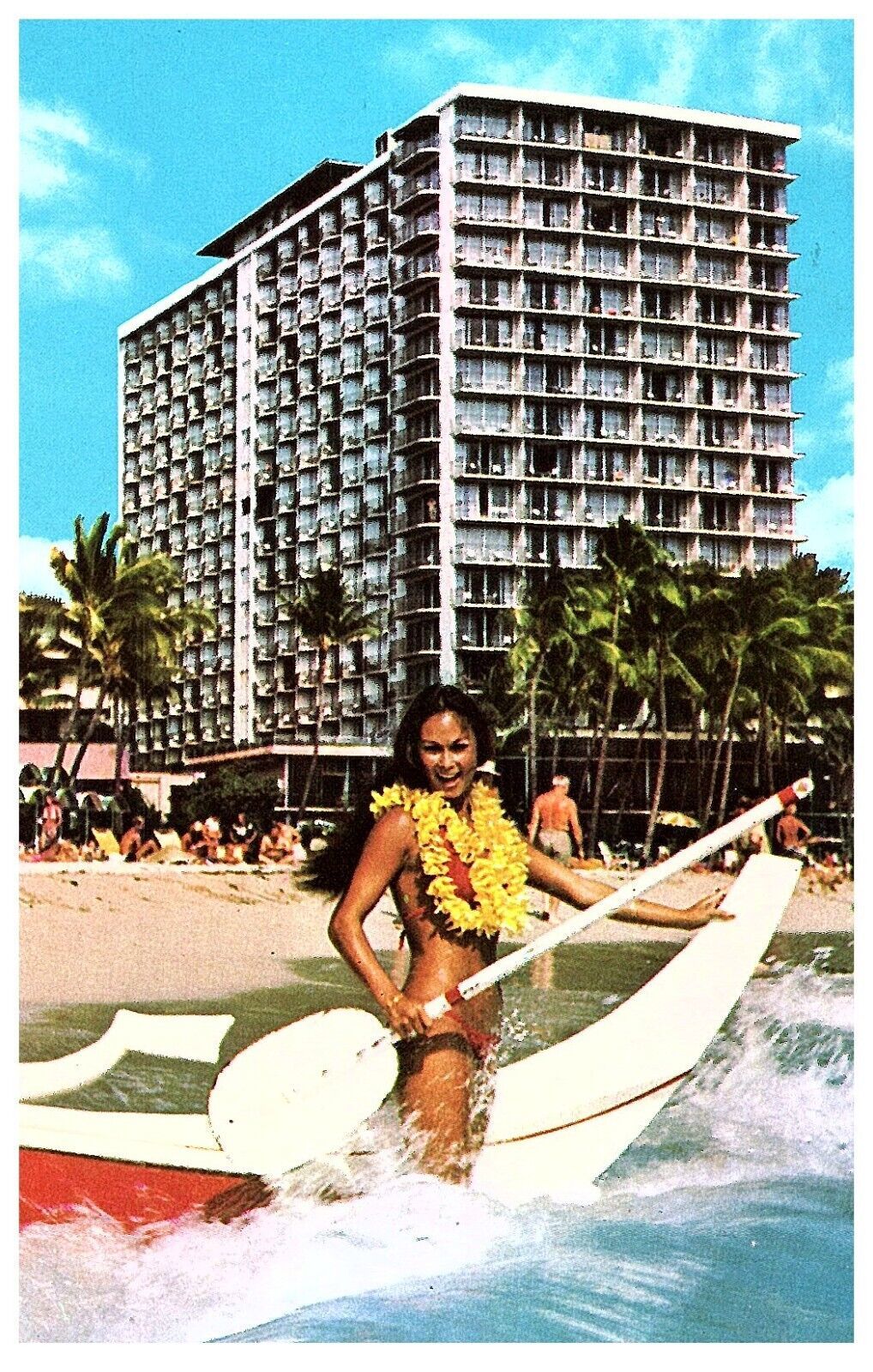 Woman in Bikini w Lei Outrigger Canoe & Hotels Waikiki Hawaii Postcard