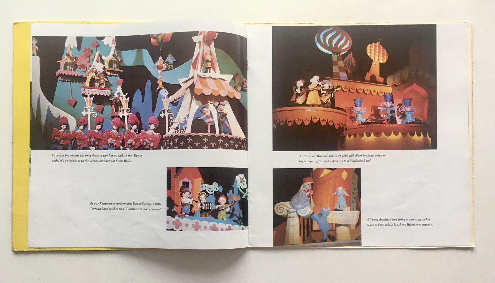 It's a Small World (currently styled it's a small world) is a water-based dark ride located in the Fantasyland area at each of the Walt Disney Parks and Resorts worldwide: Disneyland Park in California, the Magic Kingdom in Florida, Tokyo Disneyland, Disneyland Paris and Hong Kong Disneyland. The ride features over 300 audio-animatronic dolls in traditional costumes from cultures around the world, frolicking in a spirit of international unity and singing the attraction's title song, which has a theme of global peace.