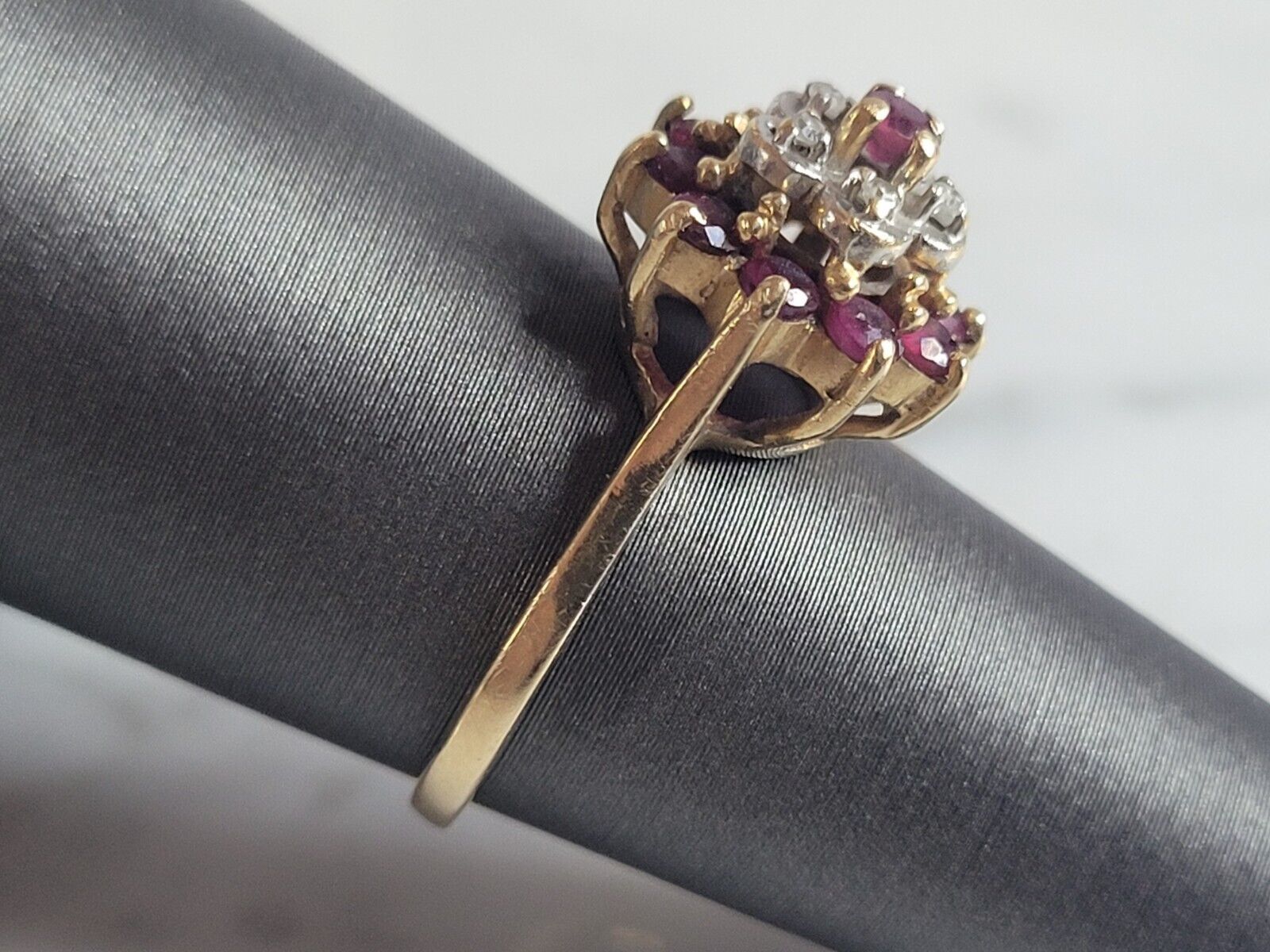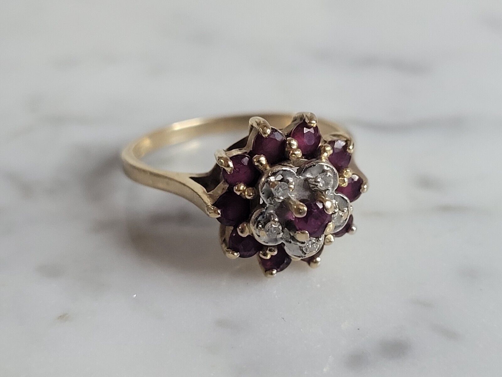 A WOMENS VINTAGE ESTATE 14K GOLD RUBY DIAMOND RING. RING IS MARKED ON THE INSIDE "14K". THE SIZE OF THE RING IS A 6.0. RING WEIGHS 3.1g AND MEASURES 3/8" WIDE. THERE ARE ABOUT .05cts OF DIAMONDS. ANY OTHER QUESTIONS PLEASE DO NOT HESITATE TO ASK. BE SURE TO CHECK OUT SOME OF MY OTHER GREAT ITEMS UP FOR SALE. THANK YOU