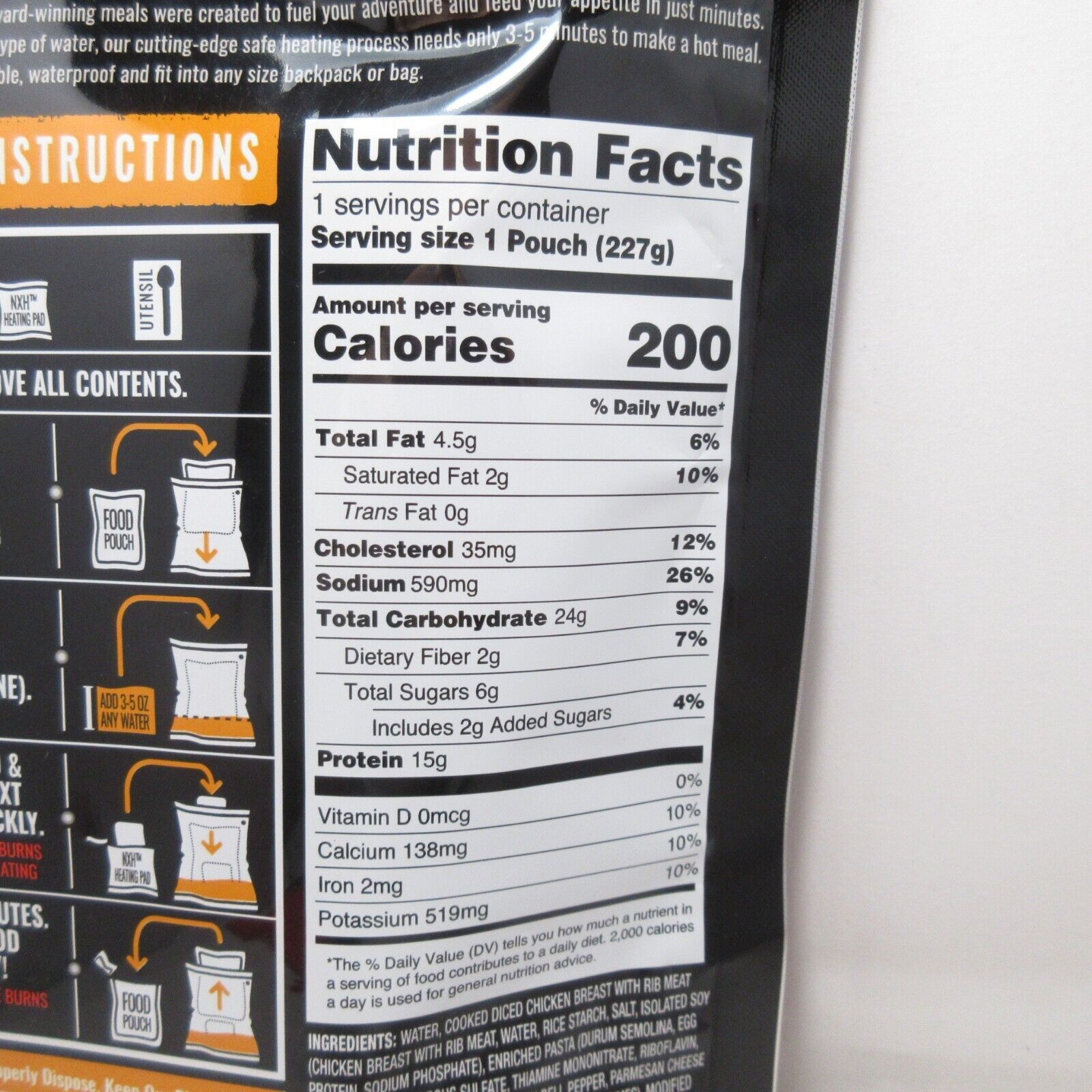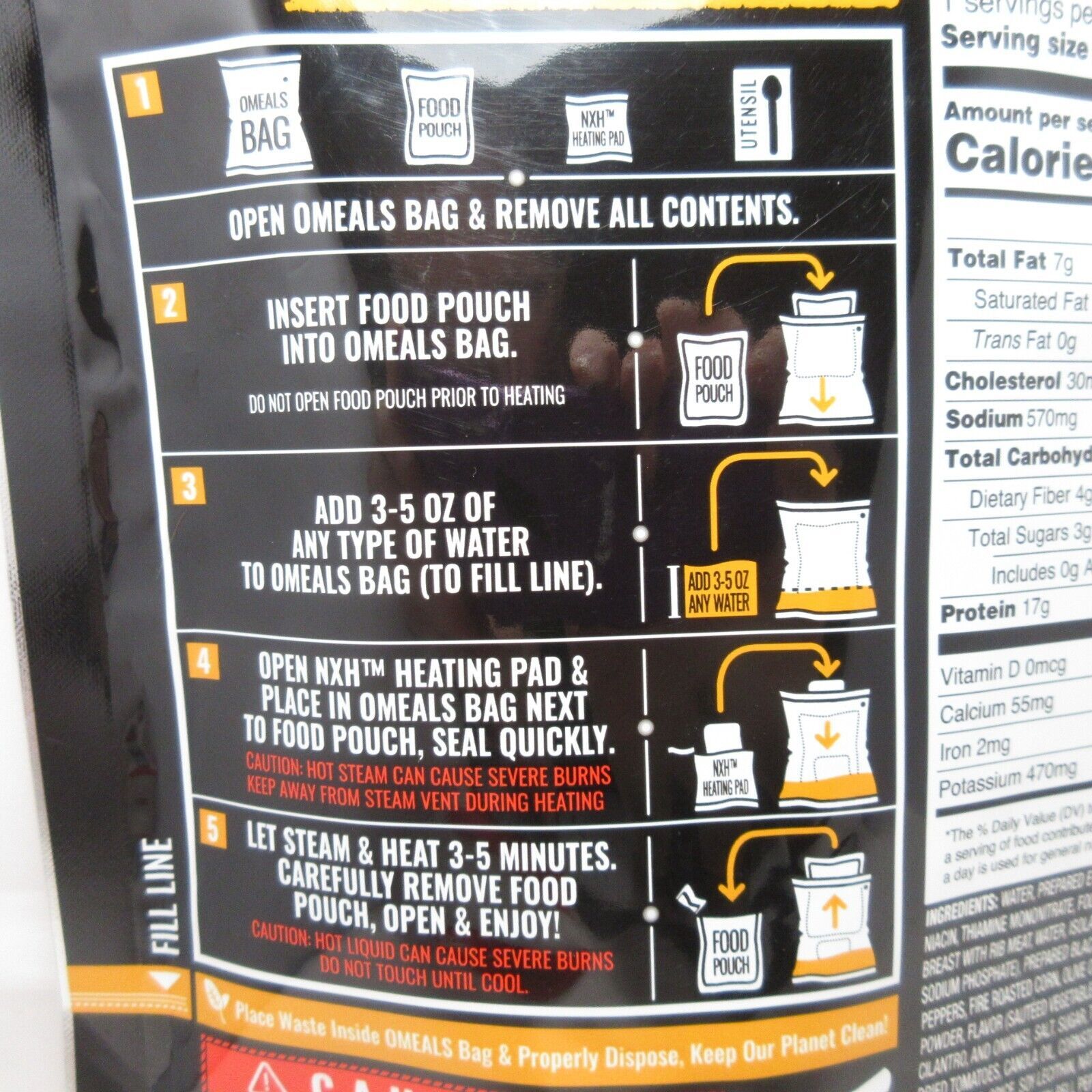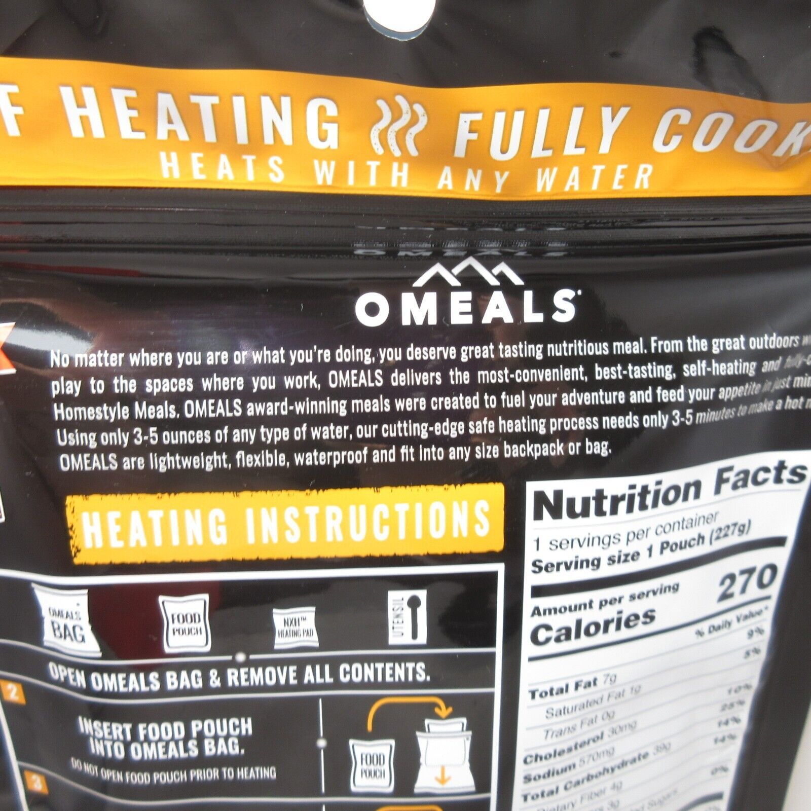 Great for outdoors, work or tactic supply. Very convenient, self-heating fully-cooked Homestyle meal. It takes 3-5 oz of any type of water and needs 3-5 minutes to heat the meal. Omeals are lightweight, flexible, waterproof and fit to any size backpack or bag.