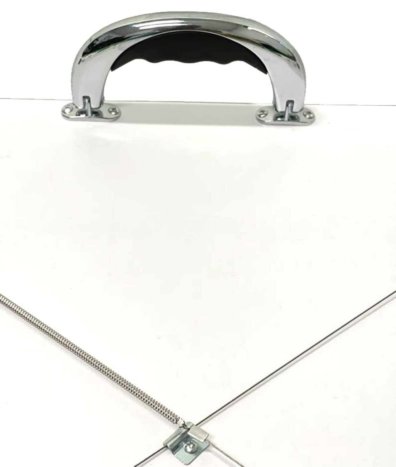 It is made with a durable particle board substrate with a smooth, warp-free white melamine laminate surface that ensures bump-free drawing. The board can be used in a flat or elevated position thanks to its folding metal legs with rubber-dipped ends that prevent scratching. The front of the board can overhang a table edge up to 8" due to rubber grip tracks underneath.