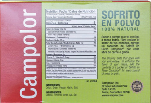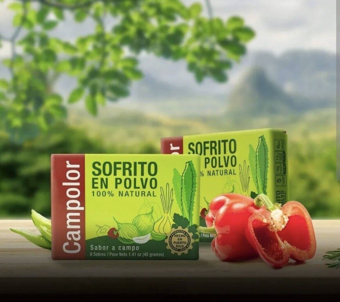 Sofrito en Polvo Campolor Puerto Rico (1 Pack - 20 sobresitos). El Sofrito no puede faltar en la cocina Puertorriqueรฑa, por eso hemos creado la formula perfecta para llevarlo a cada rincon del planeta. No necesita refrigeracion lo que lo hace mas conveniente aun. Los ingredientes son perfectamente balanceados para todos los paladares y puedes usarlos en todas tus comidas como: Sopas, Arroz, carnes, ensaladas etc. Ya no tienes que preocuparte de no conseguir todos lo ingredientes para crear tu sofrito, lo hemos hecho por ti, en fin, Sofrito en Polvo Campolor es parte esencial de tu cocina, Buen Provecho. The Country taste that goes with you everywhere. To enhance the flavor of your meals, add the content of a packet of Sofrito en Polvo Campolor for every pound of meat or grain.