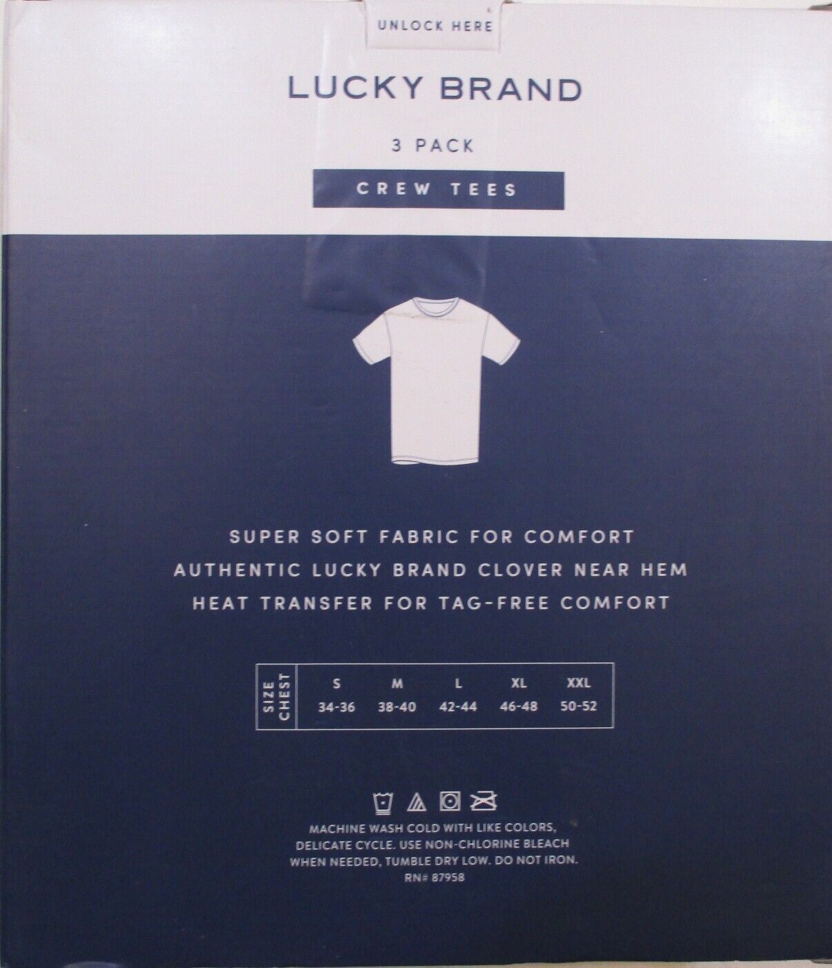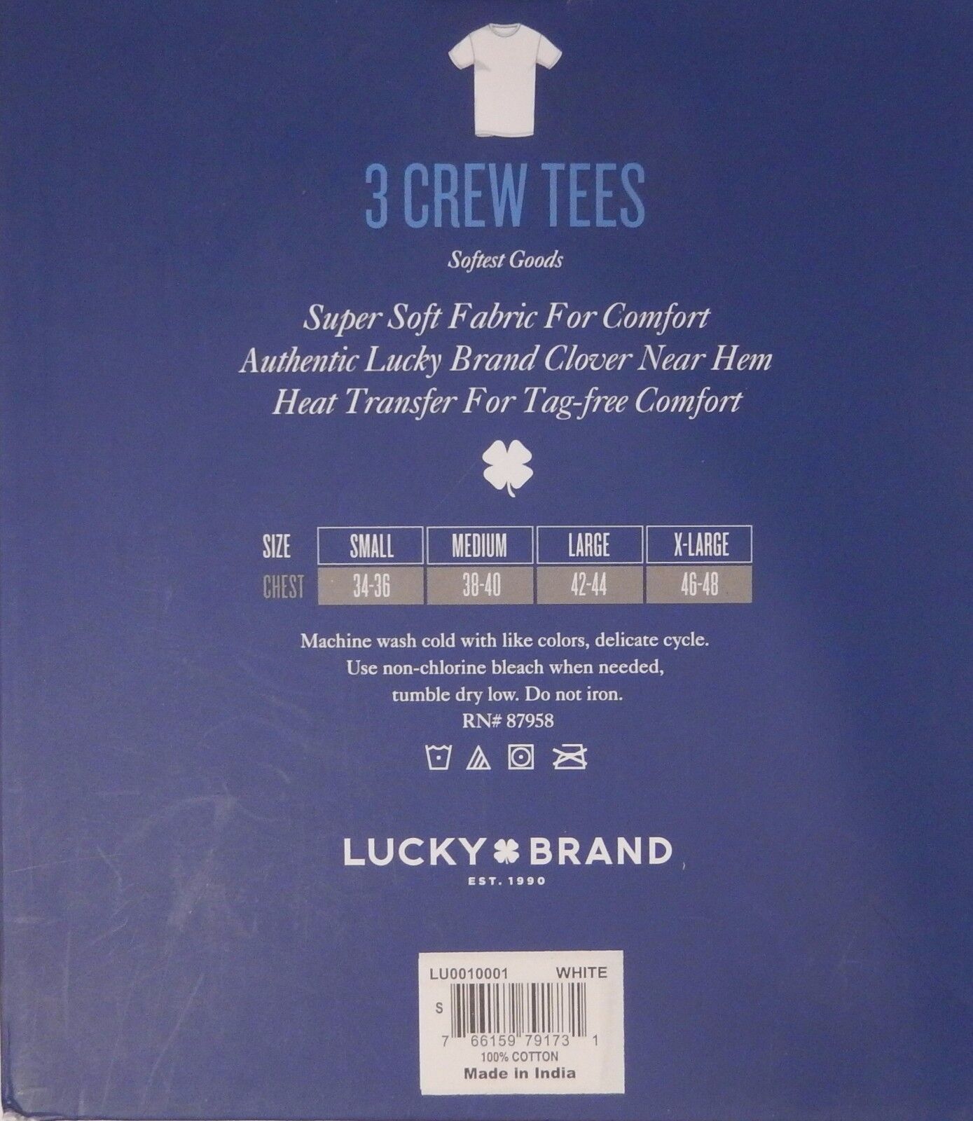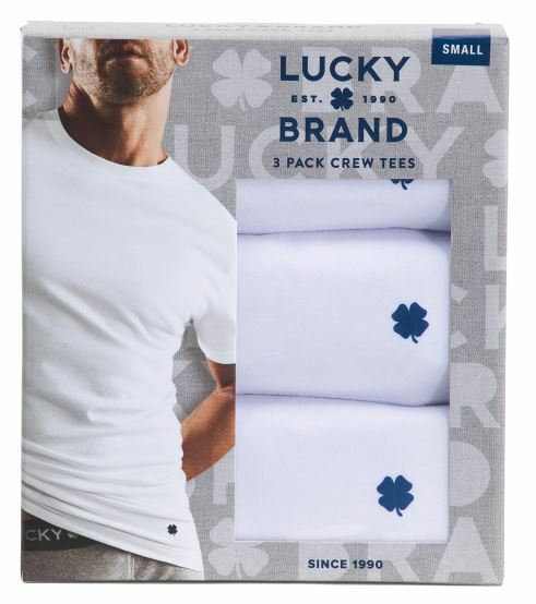 3 Genuine Lucky Brand Cotton White Crew Neck T-Shirts "Lucky You!" This listing is for 1 package of 3 T-shirts 60% Cotton / 40% Polyester.. Classic fit. Crew Neck. Super Soft Fabric for comfort. Solid white. Authentic Lucky Brand Clover Logo Near Hem. Machine washable Imported Note: Lucky Brand is in the processing of changing from 100% Cotton to the Cotton Polyester blend. If you have a preference, please let me know before ordering Size chart Chest Size S M L XL Inches 34-36 38-40 42-44 46-48 CM 86-91 97-102 107-112 117-122