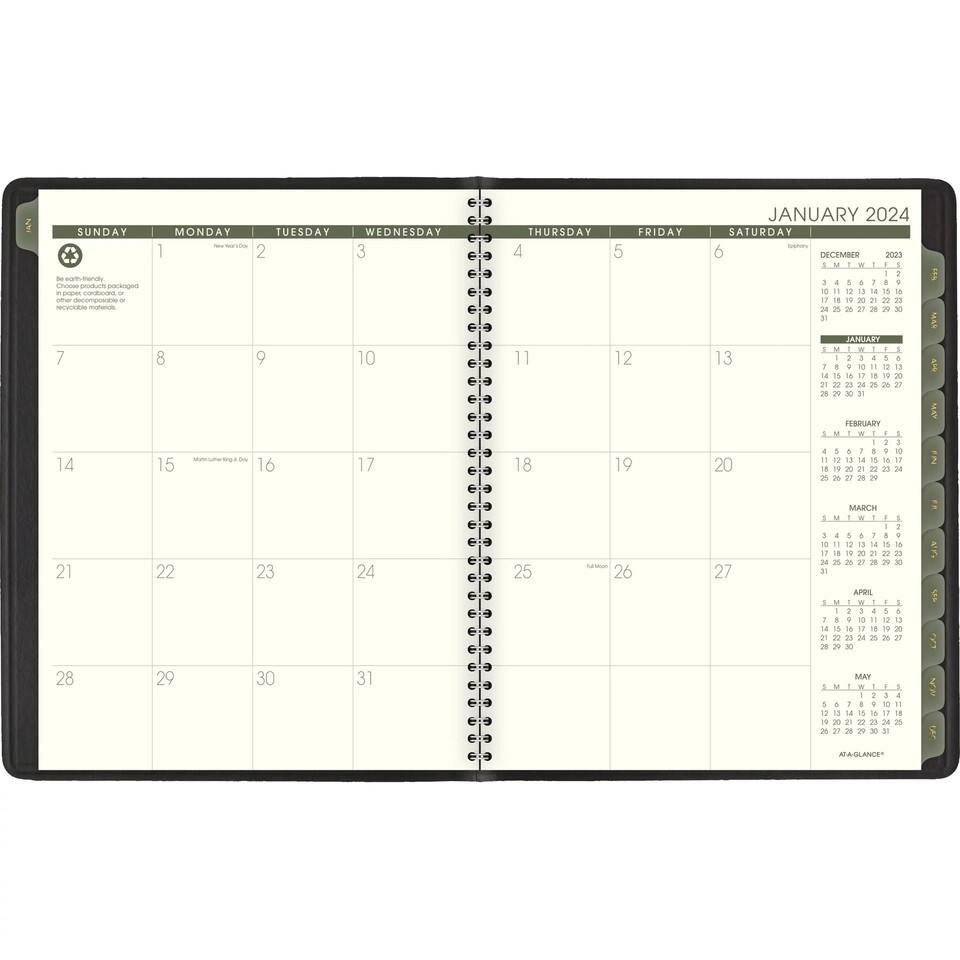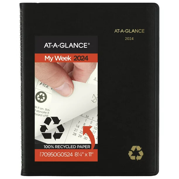 Make a green choice this year with the recycled AT-A-GLANCE weekly and monthly planner. This recycled AT-A-GLANCE planner will keep you organized and will help enhance productivity all year long. This planner is made of recycled materials and includes quarter-hourly appointment times for detailed scheduling. The planner covers 12 months from January 2024 to December 2024 with Julian dates.