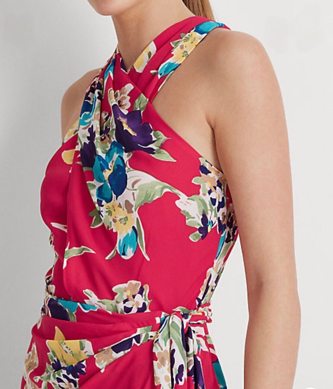 Colorful and vibrant, Lauren Ralph Laurens charming dress is distinguished by the seasons eye-catching floral motif and a graceful halter silhouette! Cut from lightweight georgette for a fluid drape, its beautiful skirt ties at the left waist for an effortless touch! Halter neckline Faux wrap waist with self tie at left side Pink multi floral print Halter style criss cross neckline Pleating at the waist and shoulders Hidden back zip closure with hook eye Fully lined Shell Lining: 100% polyester Machine wash App..