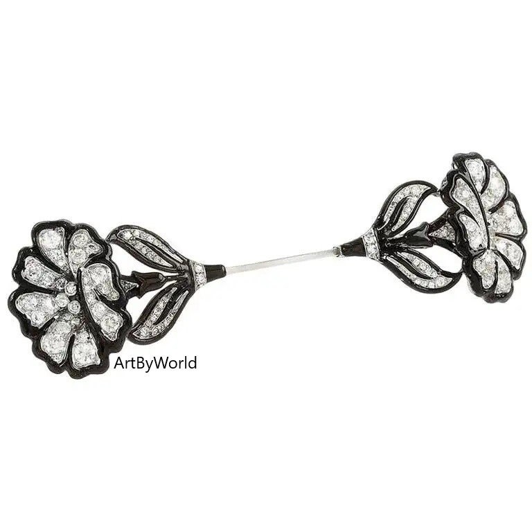 French 1920s Art Deco Diamond Enamel and Platinum Jabot Pin, Edwardian Brooch
