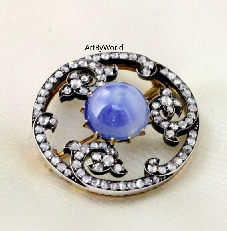 Victorian Rose Cut Diamond Blue Sapphire Brooch, Art Deco Brooch silver