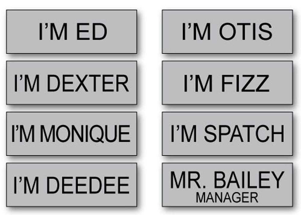 This listing is for a SET OF 8 EMPLOYEES NAME BADGES from the TV show Good Burger ON NICKELODEON Halloween Costume Props. You will receive I'M ED, I'M DEXTER, I'M MONIQUE, I'M DEEDEE, I'M OTIS, I'M FIZZ, I'M SPATCH AND MR. BAILEY, MANAGER. Your badges will arrive with a MAGNET fastener on the back. These badges are a RECTANGLE SHAPE WITH A SILVER BACKGROUND AND MEASURES APPROX. 1" x 3". This badge is printed in full color with a clear overlay that protects the print for a durable long-lasting badge. YOUR ORDER WILL SHIP WITHIN 1 DAY FREE FIRST-CLASS MAIL FROM ARIZONA, UPGRADES IN SHIPPING SPEED ARE AVAILABLE AT CHECKOUT IF NEEDED DEPENDING ON YOUR LOCATION. THESE ITEMS ARE PERFECT FOR COSPLAY!