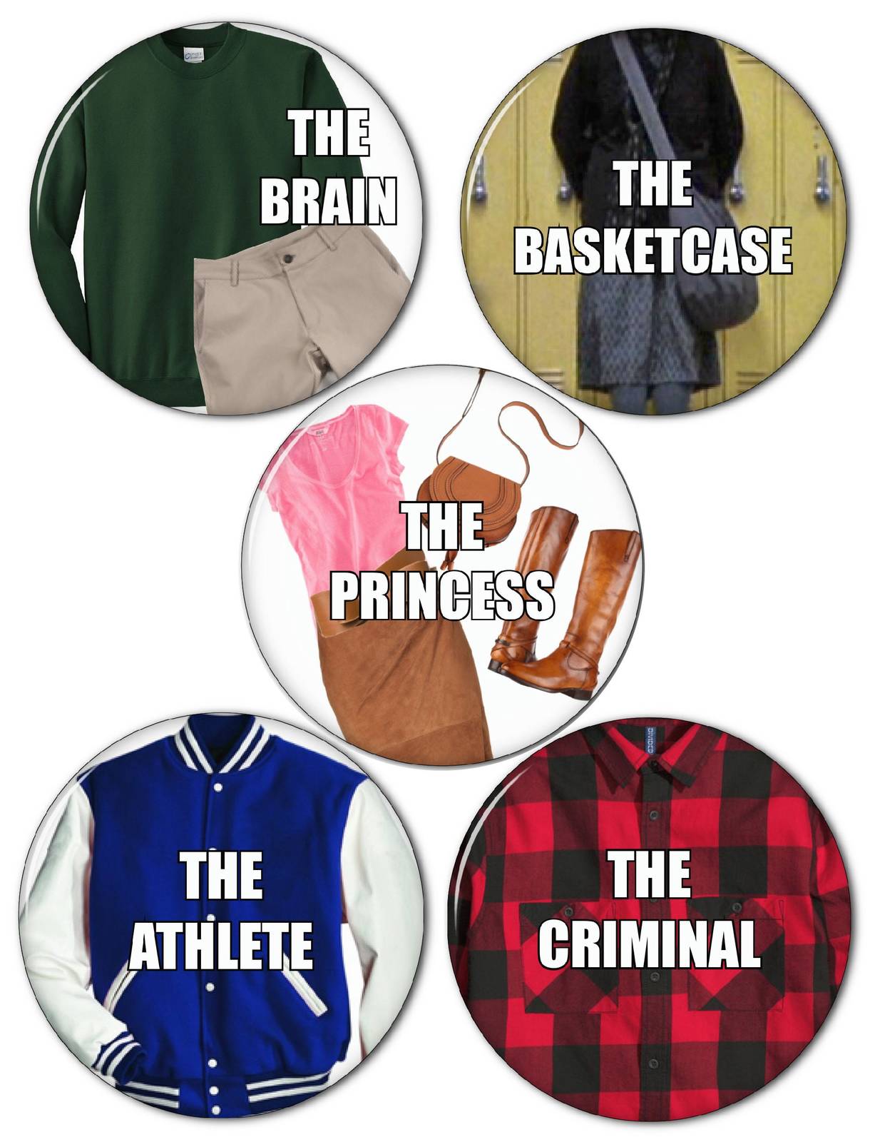 This listing is for a name badges tags ID cards for The Popular Cast from the movie The Breakfast Club. You will receive 7 name badges for Claire Standish, Andrew Clark, Brian Johnson, John Bender, Allison Reynolds, Richard Vernon and Carl Reed. You will also receive 5 3" pin back buttons for The Athlete, The Criminal, The Princess, The Basket Case and The Brain. Check our ebay store for the whole cast. Your badges will arrive with a pin fasteners on the back. This badge is a plastic rectangle with white background, rounded corners and measures approx. 2" x 3". This badge is printed in full color with a clear overlay that protects the print for a durable long lasting badge. YOUR BADGE WILL SHIP WITHIN 24 HOURS FREE FIRST CLASS MAIL, US ONLY. Upgrades to shipping speed are available at checkout if needed.THESE ITEMS ARE PERFECT FOR HALLOWEEN COSTUMES OR FUN COSPLAY!