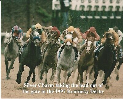 This is a captioned, 10" x 8" close-up color photo of SILVER CHARM taking the lead right out of the starting gate in the 1997 Kentucky Derby. This photo was printed on a top quality photographic paper and is in MINT Condition. FREE packaging and First Class Postage shipping in the U.S.A. International Postage cost will be determined by the Country of the buyer. If you purchase more than one item please pay for all the items with one combined payment rather than paying for each item individually.. If you want this photo printed "without the captioning", add that request in "Note To Seller" with your payment. Otherwise it will come captioned, as shown. If you would like this photo printed in a larger size I can offer a 20" x 16" for $60.00 or a 30" x 24" for $100.00. Mailing tube and First Class Postage shipping is included in the U.S.A. To pay for the 20" x 16" size just order three 10" x 8"s and pay $60.00. Also, add in "Note to Seller", with your payment, that you are ordering the 20" x 16" size. To pay for the 30" x 24" size just order five 10" x 8"s and pay $100.00. Also, add in "Note to Seller", with you payment, that you are ordering the 30" x 24" size.