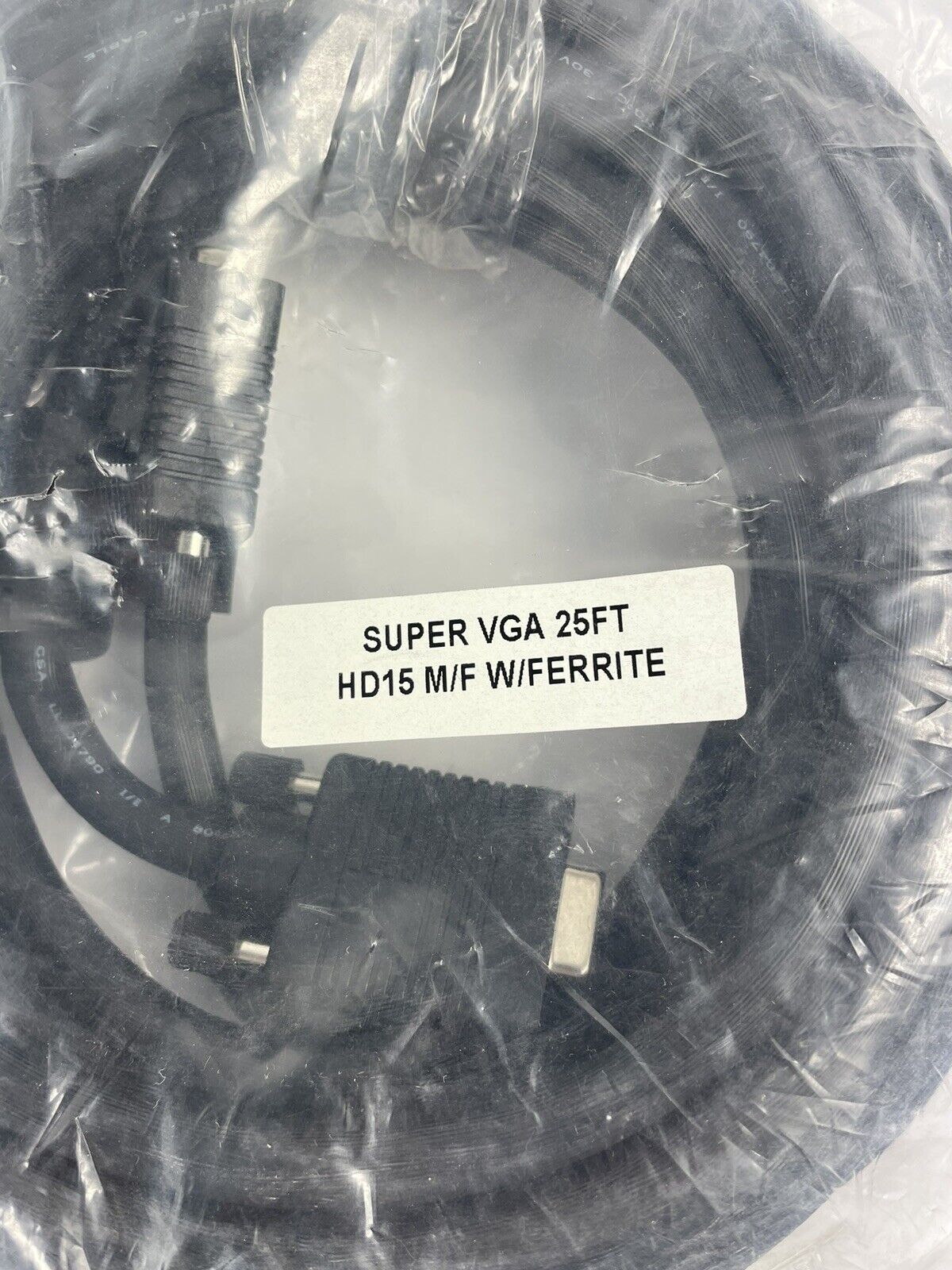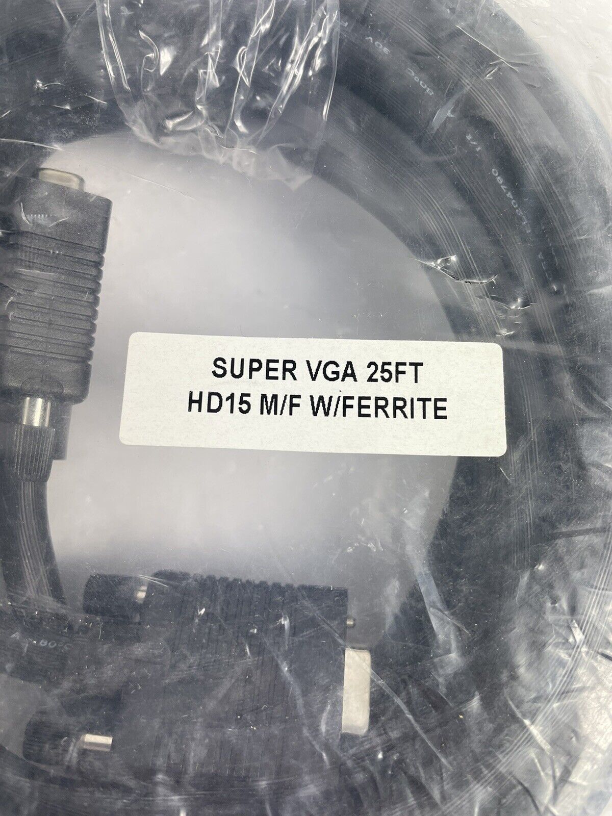 Brand New 25 Ft Super VGA SVGA HD15 Video Extension Cable Cord 28 AWG TV PC MAC Mon M/F Premium HD15 15 pin SVGA VGA extension cables is a low-loss, heavy duty molded cable. This male to female extension cables are ideal for extend connection on your monitor display or TV video to your PC MAC computer. - SVGA HD15 15 pin male to SVGA HD15 15 pin female. -SVGA Conductors: 3 Mini Coaxial and 4.5 Twisted Pairs. -EMI filter ferrites and double shielded with foil and braid for EMI/RFI interference. -Resolution up to maximum of 800 x 600. -28 AWG. -Cable color: Black. -Standards: RoHS, UL, CSA, ISO 9001:2000 manufacturer.