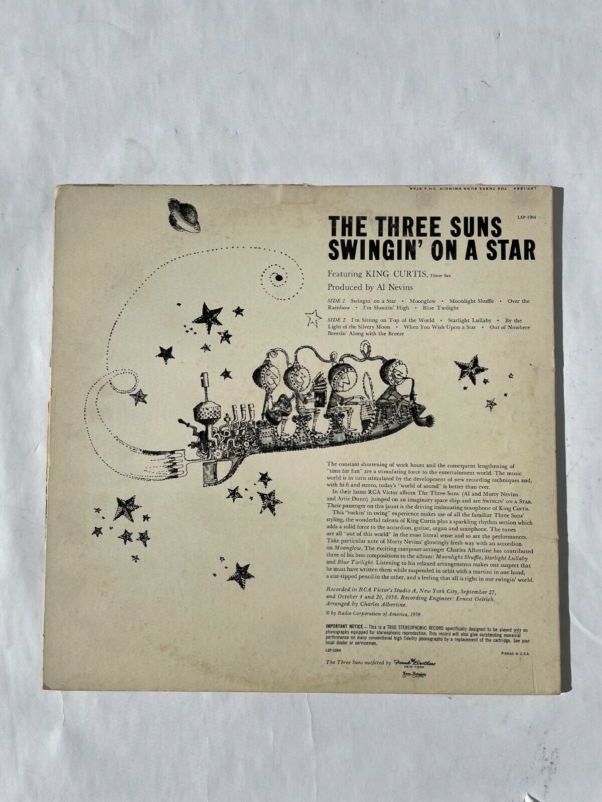 - Featuring: The Three Suns Swingin On a Star Vinyl Record Q10 - Record is Clean. Cases have some Scuffs, Scratches, and Cracks - Free Shipping -Free Returns - Swingin on a Star - Moonglow - Moonlight Shuffle - Over the Rainbow - I'm Shootin High - Blue Twilight - I'm Sitting on Top of the World - Starlight Lullaby - By the Light of the Silvery Moon - When You Wish Upon a Star - Out of Nowhere Breezin Along with the Breeze