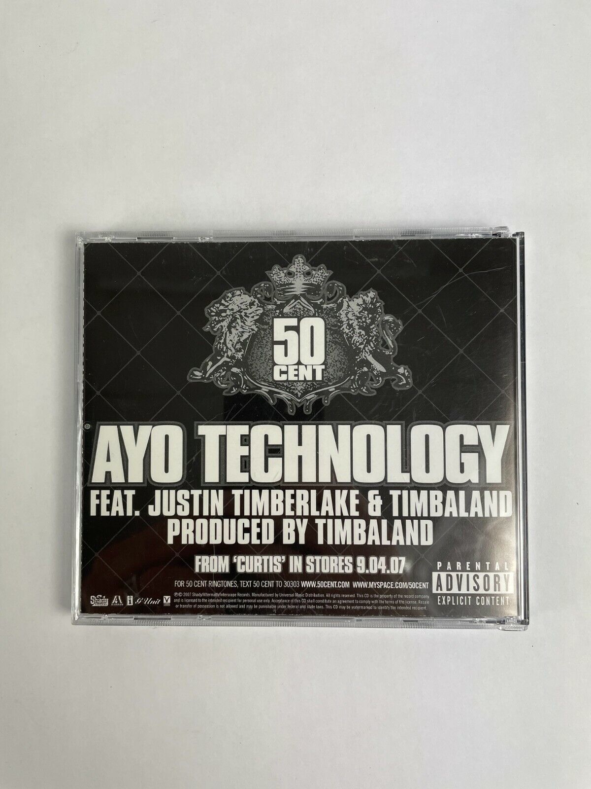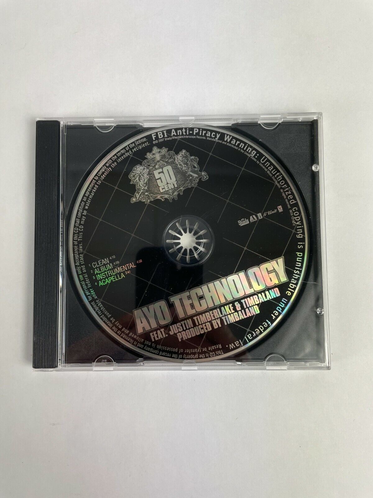 - Featuring: 50 Cent Ayo Technology Feat.Justin Timberlake amp;Timbaland Disc Q11 - CD is Clean. Cases have some Scuffs, Scratches, and Cracks - Free Shipping -Free Returns - Clean (4:10) - Album (4:09) - Instrumental (4:08) - Acapella (3:41)