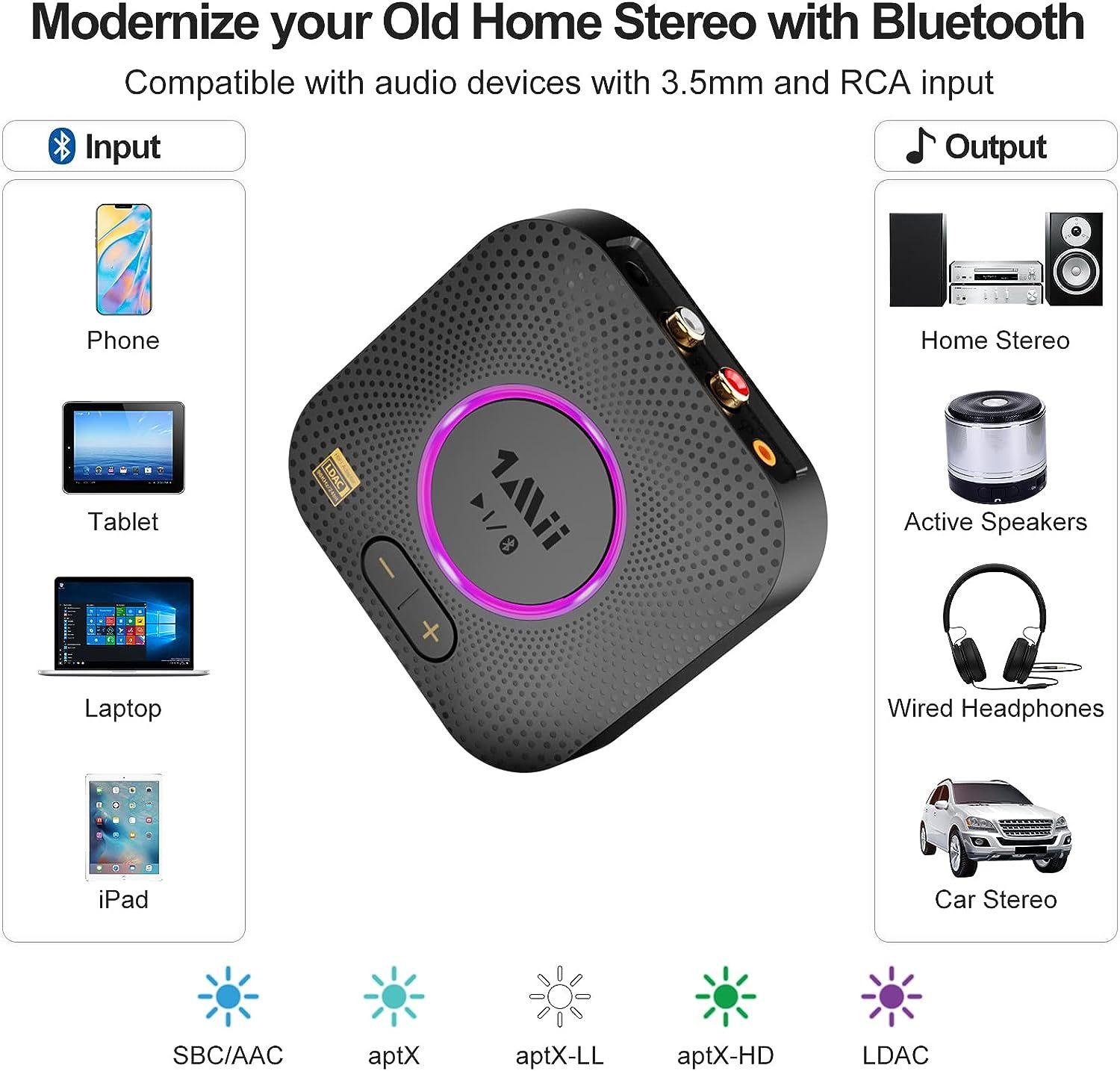 ?Upgraded New Function?With B06S+, let non-Bluetooth-enabled home stereo/powered speakers/amplifier/av receiver conect to iPhone/Android wirelessly streaming your favorite music. Added LED light circle design, you can know the switching of codec formats timely. Each color corresponds to the decoding format one by one. ?LDAC+aptx LL/HD?B06S+ HiFi Bluetooth Audio Adapter adopts LDAC audio codec, making the max transmission rate up to 990 kbps, streaming Hi-Res audio beyond "CD" quality up to 96k/24bit with less than 30ms delay. The LDAC Bluetooth Receiver Adapter also with aptx HD and aptx low latency if your devices support "aptx-LL". ?Bluetooth 5.2 Hi-Res Audio?With premium Qualcomm 5.2 chip to ensure fast and stable high fidelity Bluetooth connection, allowing keep high-definition music in the speakers always. With stronger compatibility, including Bluetooth 5.0/4.2/4.0, etc. No need to worry about pairing. ?Long Working Distance?B06S+ Long Range Bluetooth Receiver supports a signal range of 50-100ft(15-30m). Usually this is enough for the whole house. Tips: Operation range may be affected by the Walls or WiFi routers. ?Easy Setup w/ Volume Control?B06S+ RCA Bluetooth Receiver also with 3.5mm audio output. Just easily plug, pair and play. Once connected, it will auto-reconnect next time until reset. Plus, short press "+/-" buttons can adjust volume up/down, long press to swtich previous/next song. **Any issues? Just contact us to solve it for you.