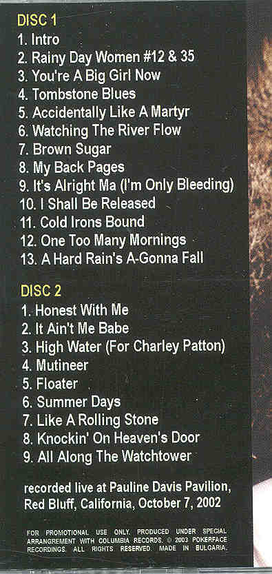 Bob Dylan - Don't Poker In Red Bluff ( 2 CD set ) ( Pauline Davis Pavillon . Red Blues . California . USA . October 7th . 2002 )