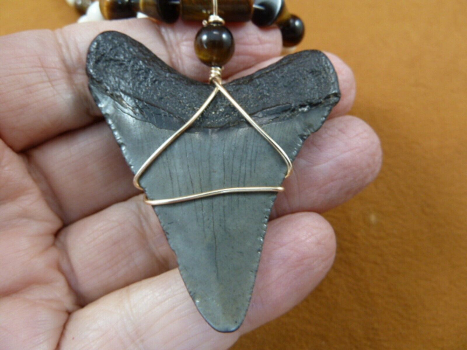 s260-b) 2-1/4" Ancient MEGALODON T**th white ache + tigereye beaded 21" Necklace