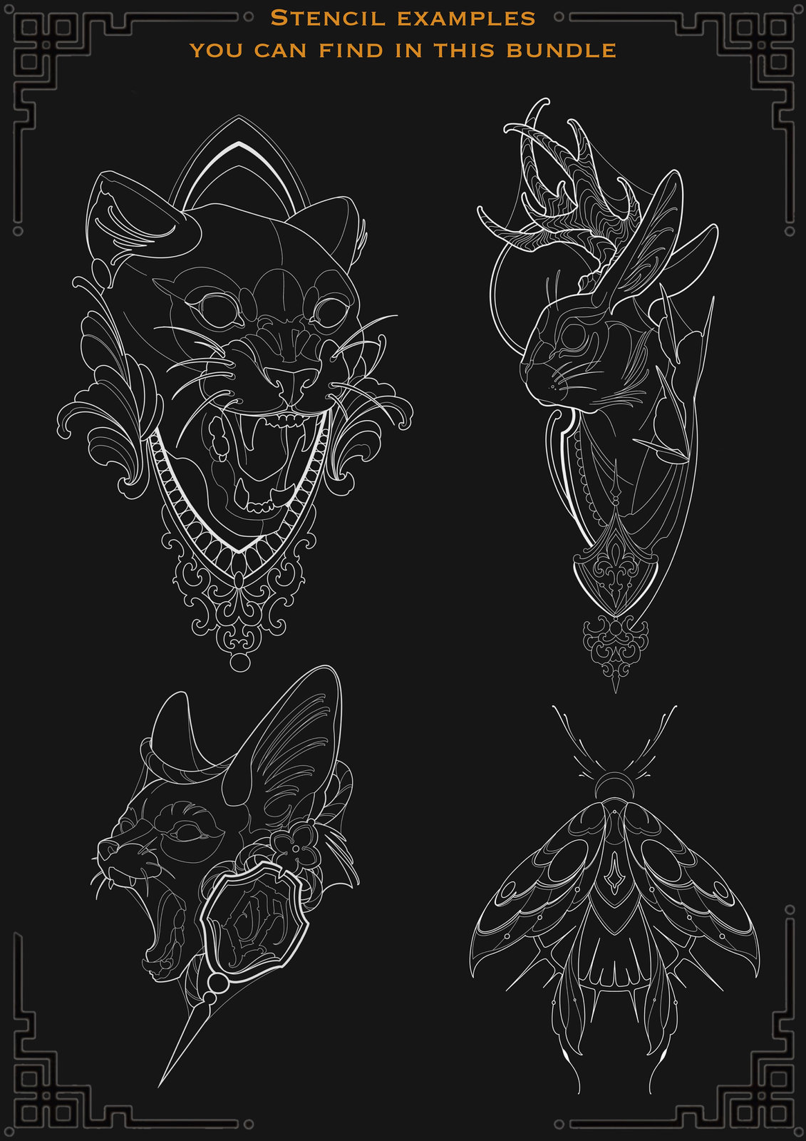 These are tattoo stencils and tattoo flash designs to make your work easier before tattooing and also for undecided clients. This brushset have a great variety and very customizable.