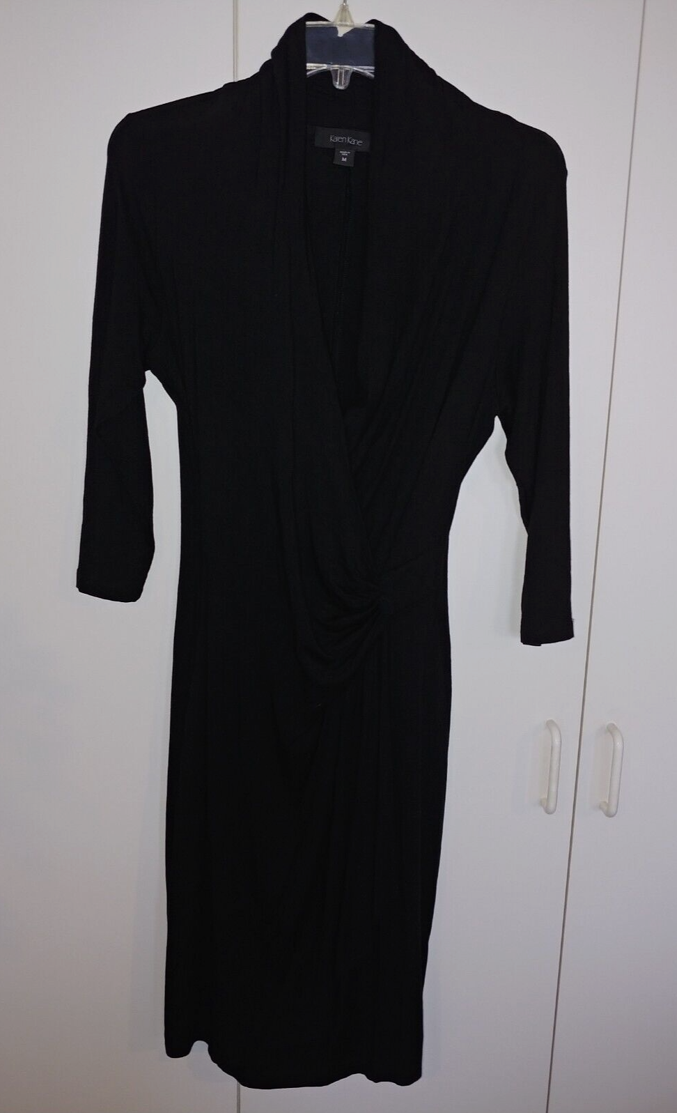 KAREN KANE LADIES 3/4-SLE. BLACK SOFT KNIT LOW CROSSOVER "V" NECK DRESS-M-RUCHED