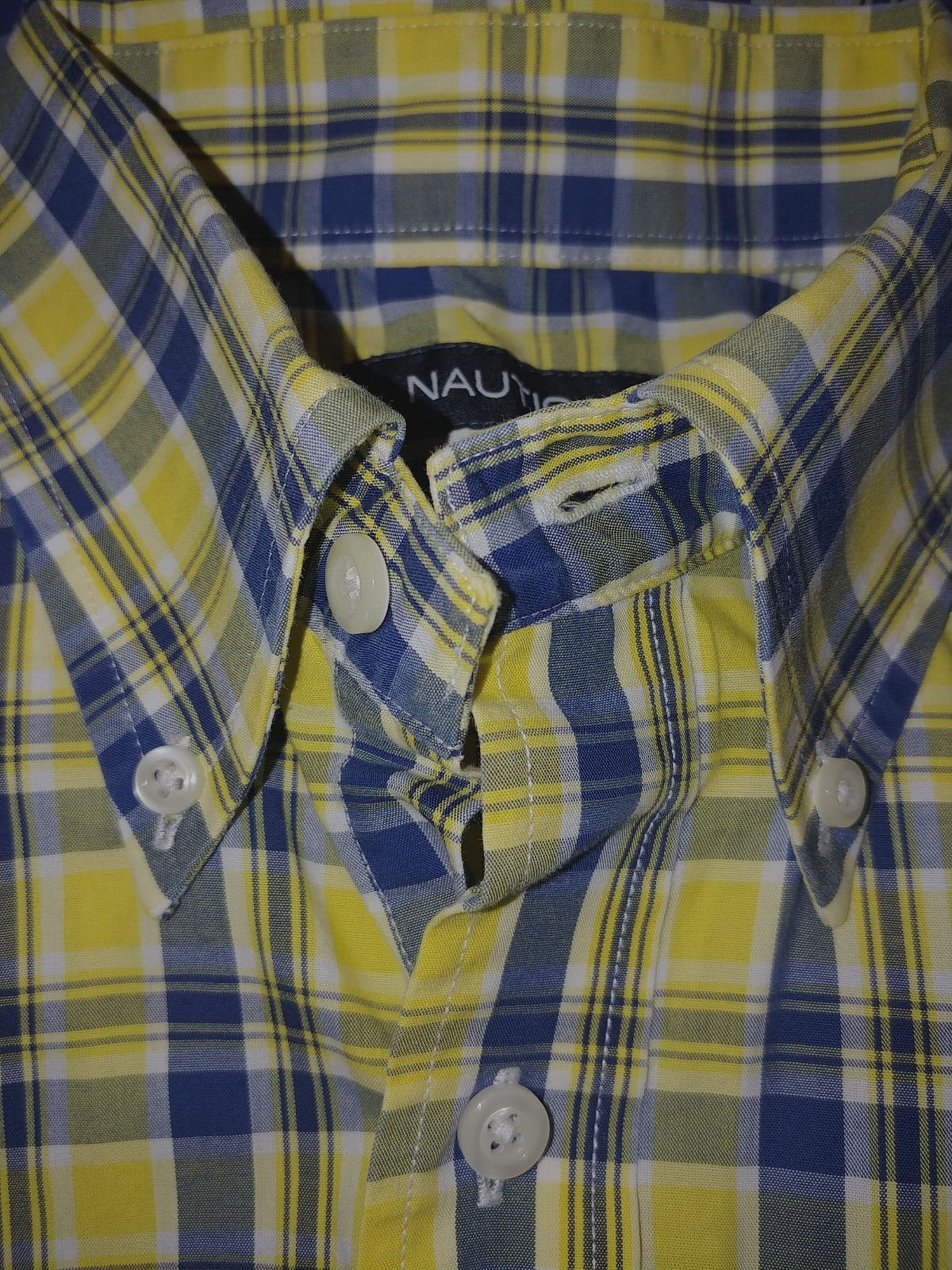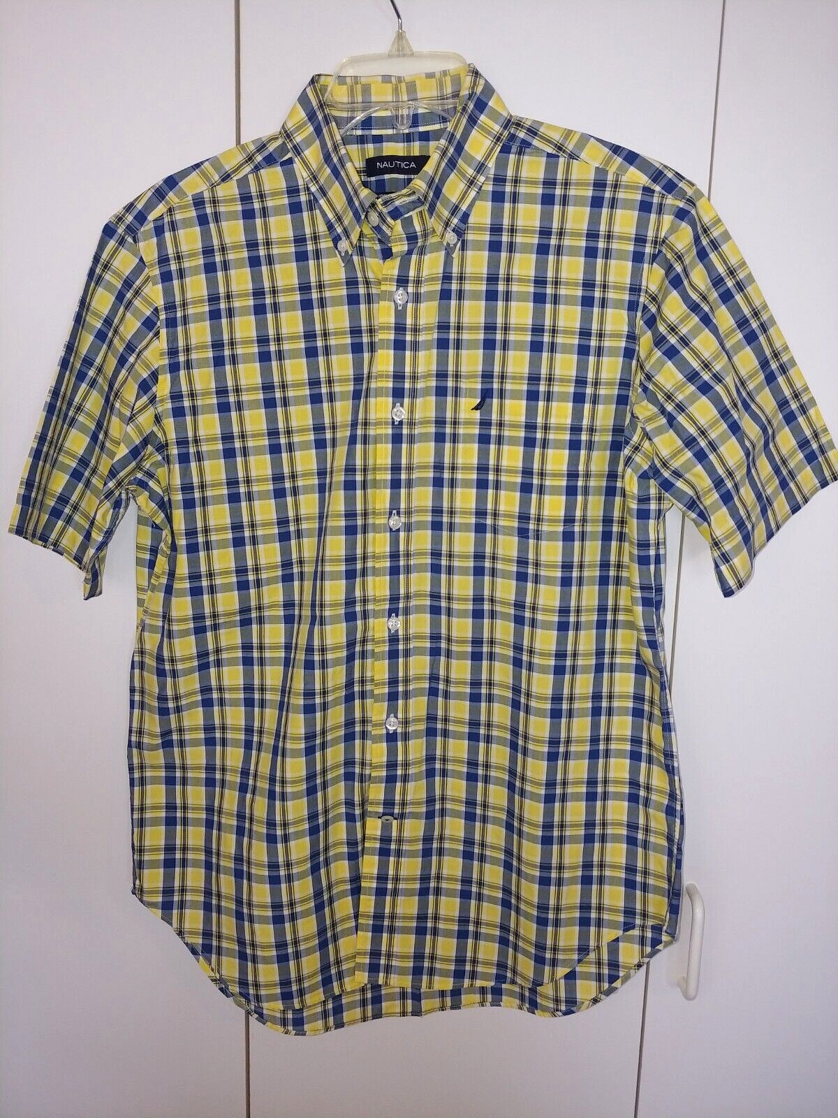 THIS IS A NICE MEN'S NAUTICA SHORT-SLEEVED 100% COTTON YELLOW/BLUE PLAID BUTTON-DOWN SHIRT IN A SIZE MEDIUM. IT IS IN EXCELLENT, WORN AND WASHED ONCE, CONDITION.