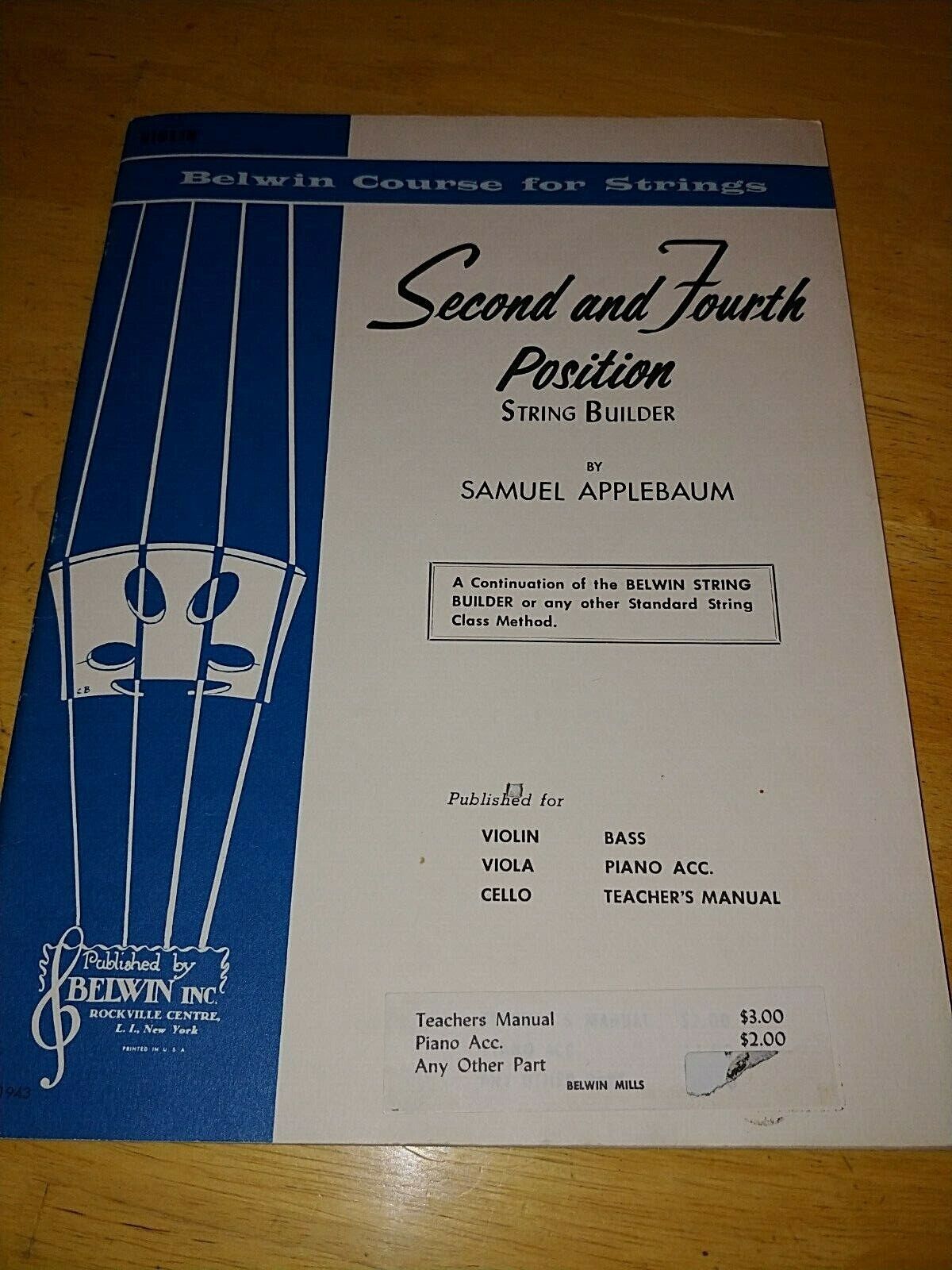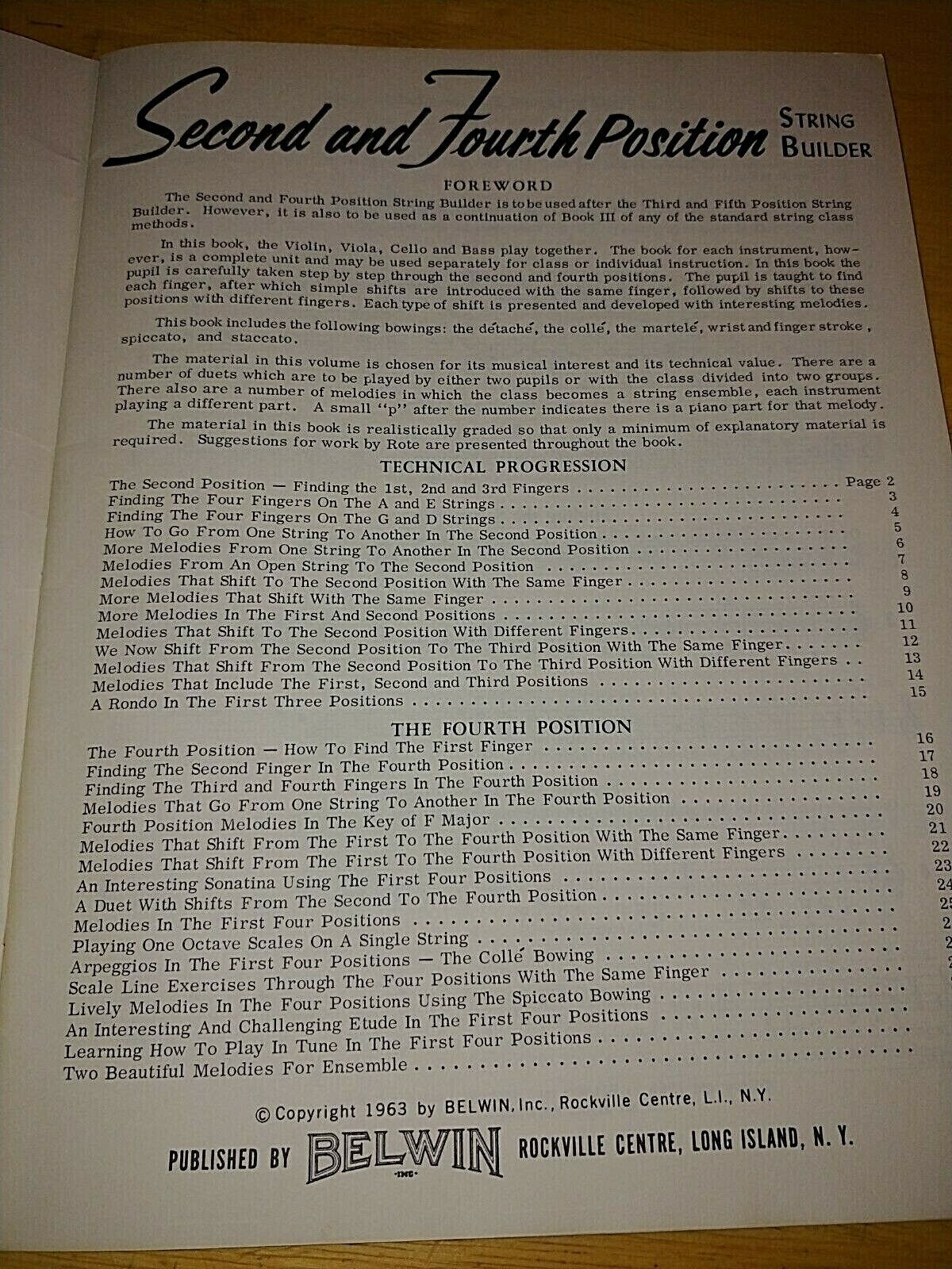 THIS IS A VINTAGE 1963 BELWIN COURSE FOR STRINGS SECOND AND FOURTH POSITION STRING BUILDER BY SAMUEL APPLEBAUM. IT IS IN GREAT VINTAGE CONDITION WITH LIGHT SHELF WEAR ON COVER AND NO MARKINGS INSIDE.