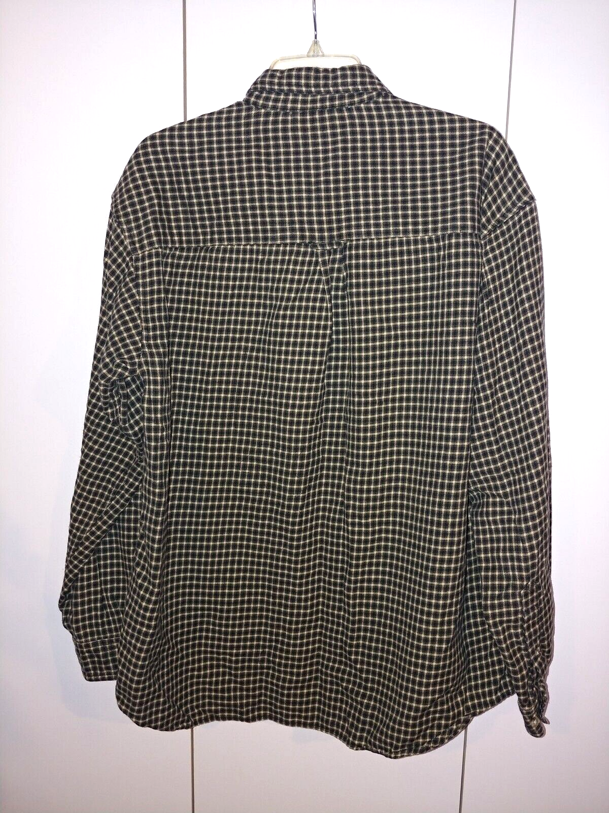 THIS IS A NICE MEN'S COLUMBIA GREEN/BEIGE PLAID 100% COTTON FLANNEL BUTTON-DOWN SHIRT IN A SIZE XL. IT IS IN GREAT, GENTLY WORN, CONDITION BUT DOES HAVE THE ONE SMALL MEND WHERE IT WON'T SHOW WHEN TUCKED IN.