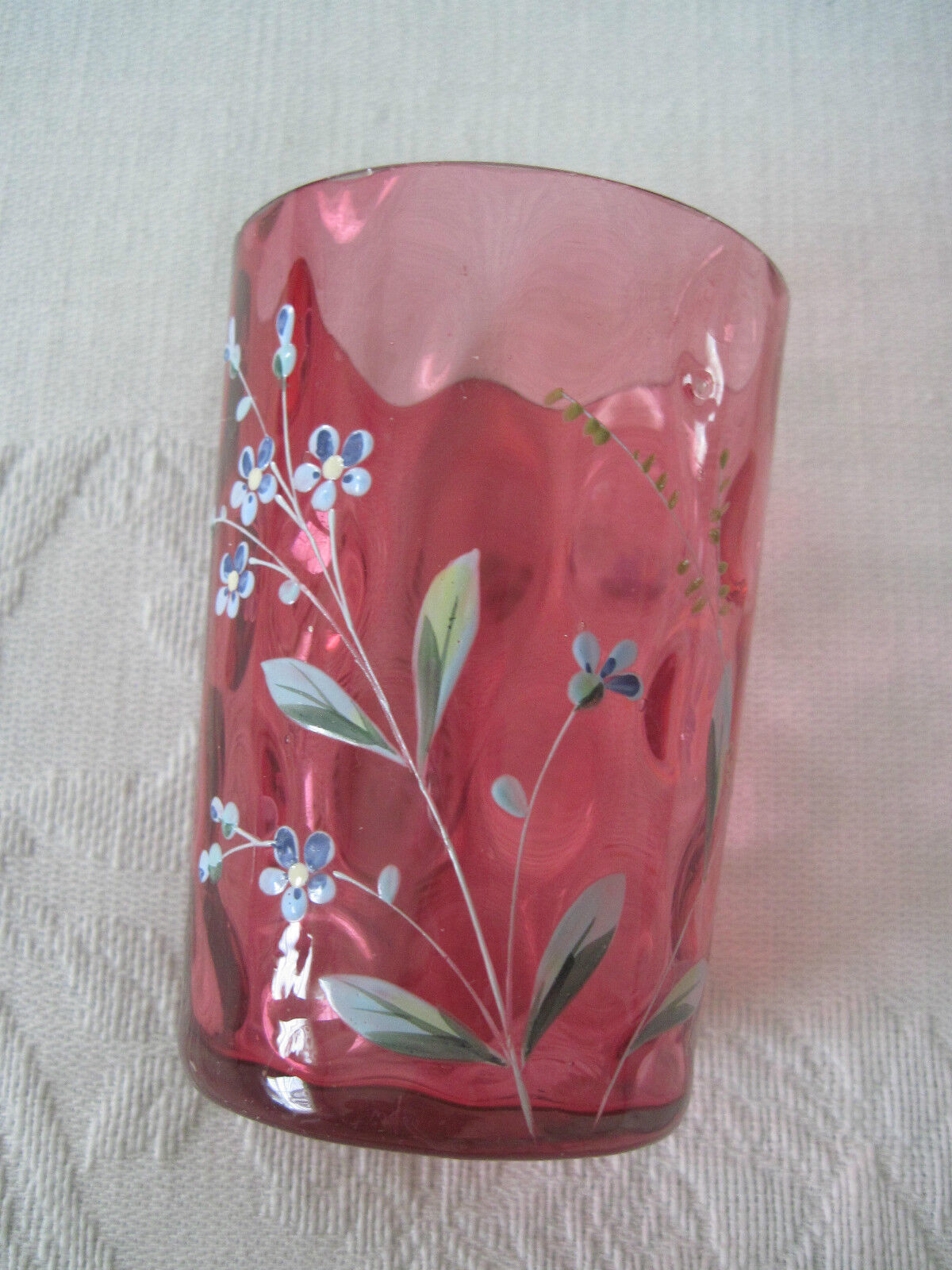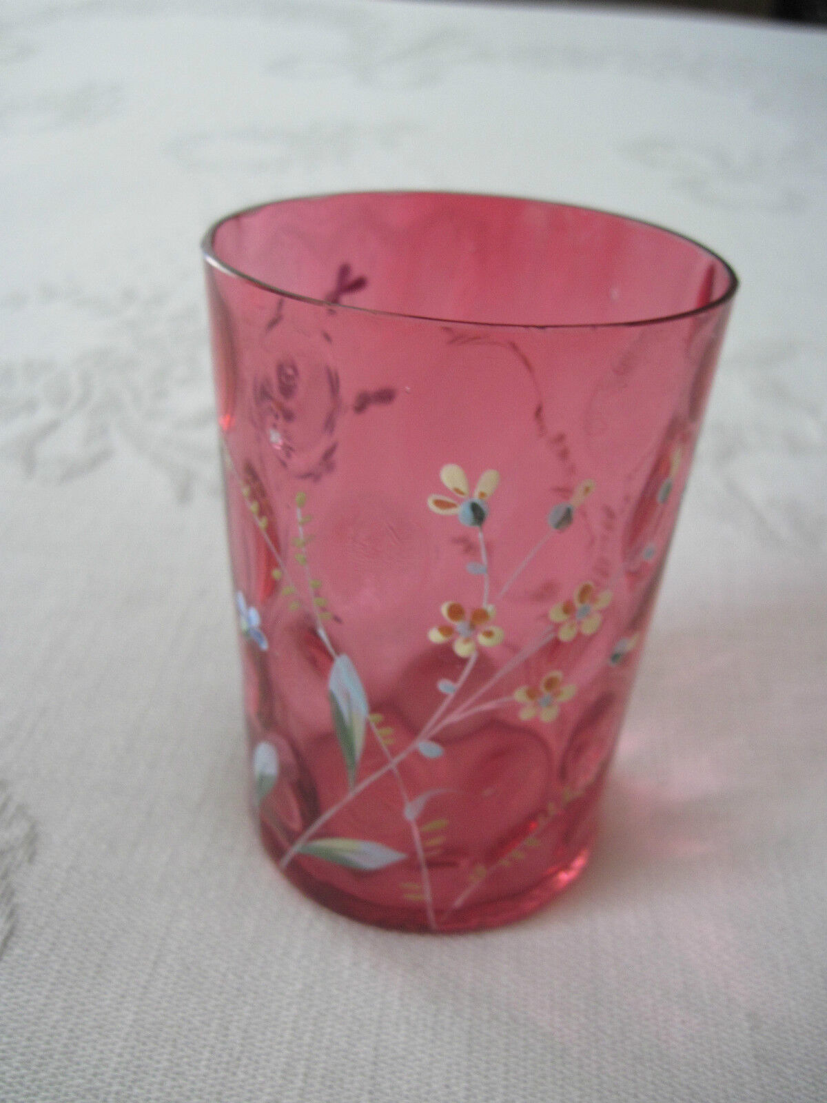 This is a gorgeous vintage pink depression 3 3/4" tall glass with a lovely enameled floral design. It is in excellent condition; I'm not sure if there are some very tiny fleabites on top edge or if is the way the glass is cut. It seems like the glass was cut that way.