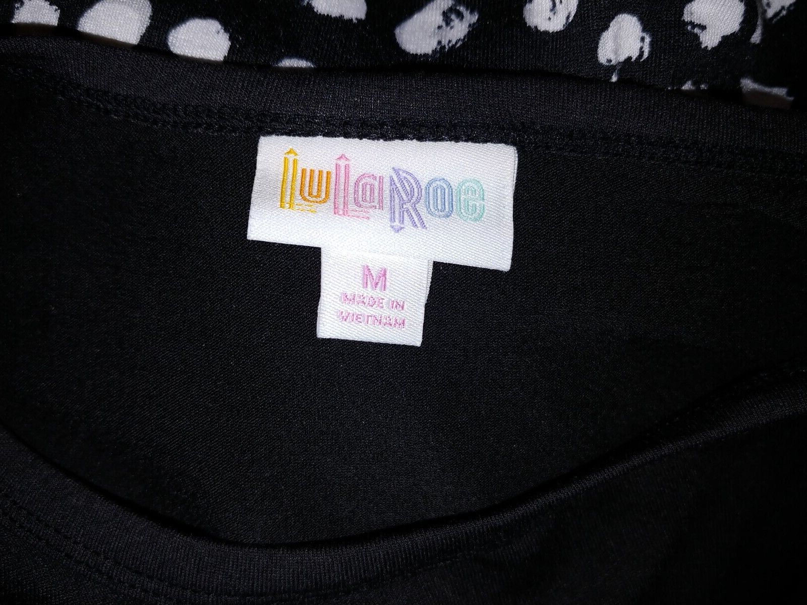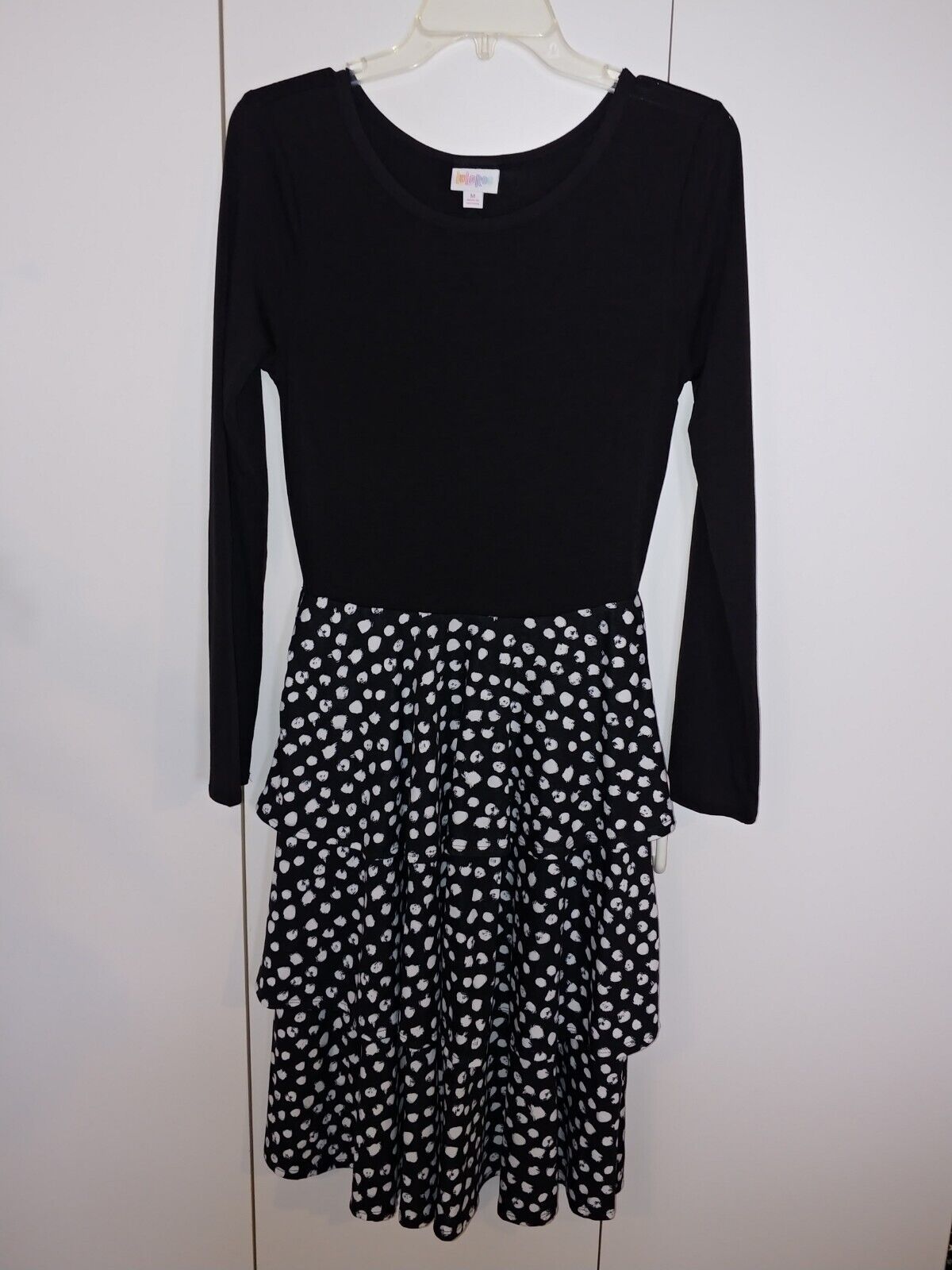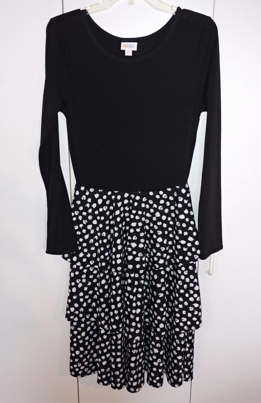 THIS IS A NICE LADIES LuLaRoe BLACK/WHITE STRETCH KNIT PULLOVER TIERED DRESS IN A SIZE MEDIUM. IT IS IN EXCELLENT, WORN ONCE, CONDITION; WASHED WITH DETERGENT THAT LEAVES A LINGERING SMELL.