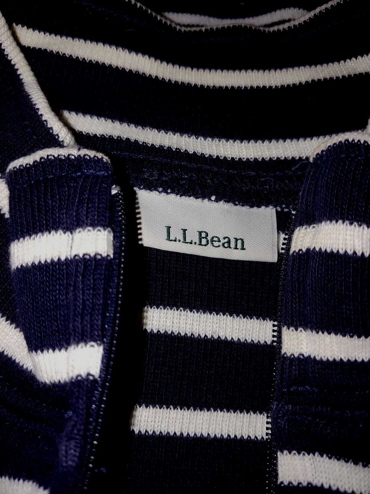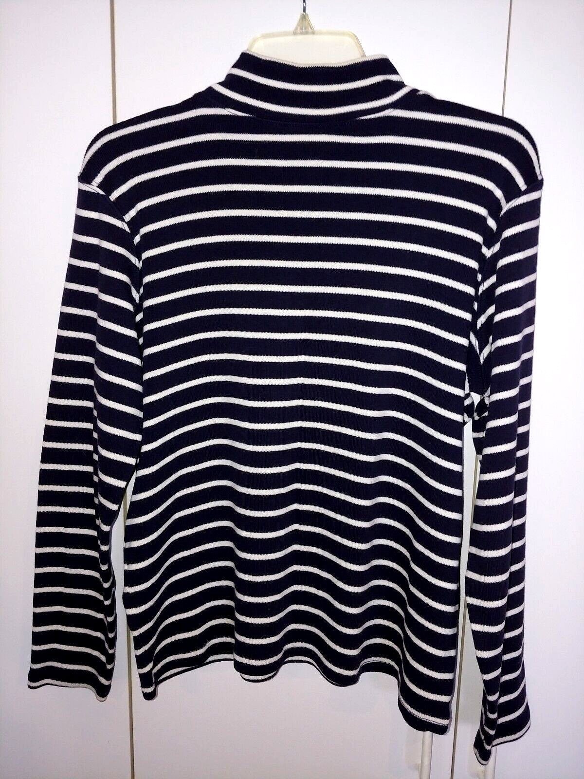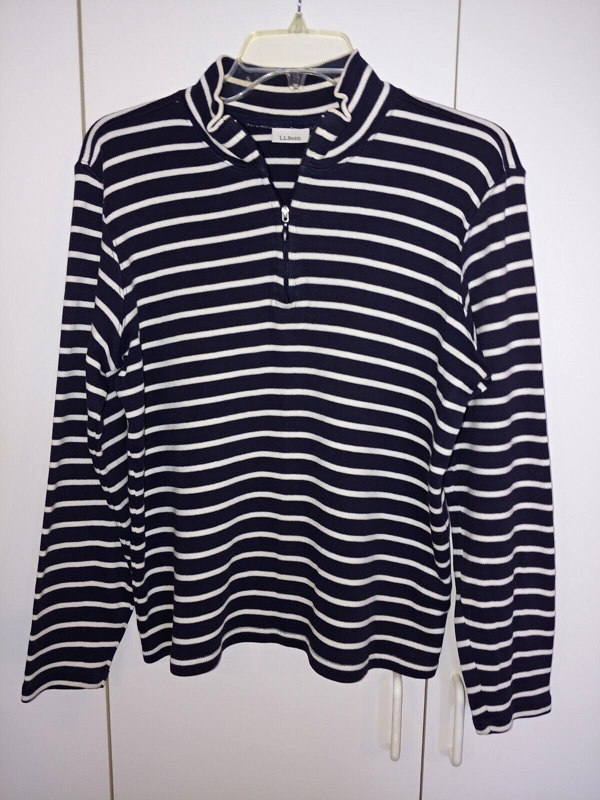 THIS IS A GREAT LADIES L.L. BEAN LONG-SLEEVED HALF-ZIP NAVY/WHITE STRIPED PULLOVER SWEATER IN A SIZE LARGE. IT IS IN EXCELLENT, WORN ONCE, CONDITION.