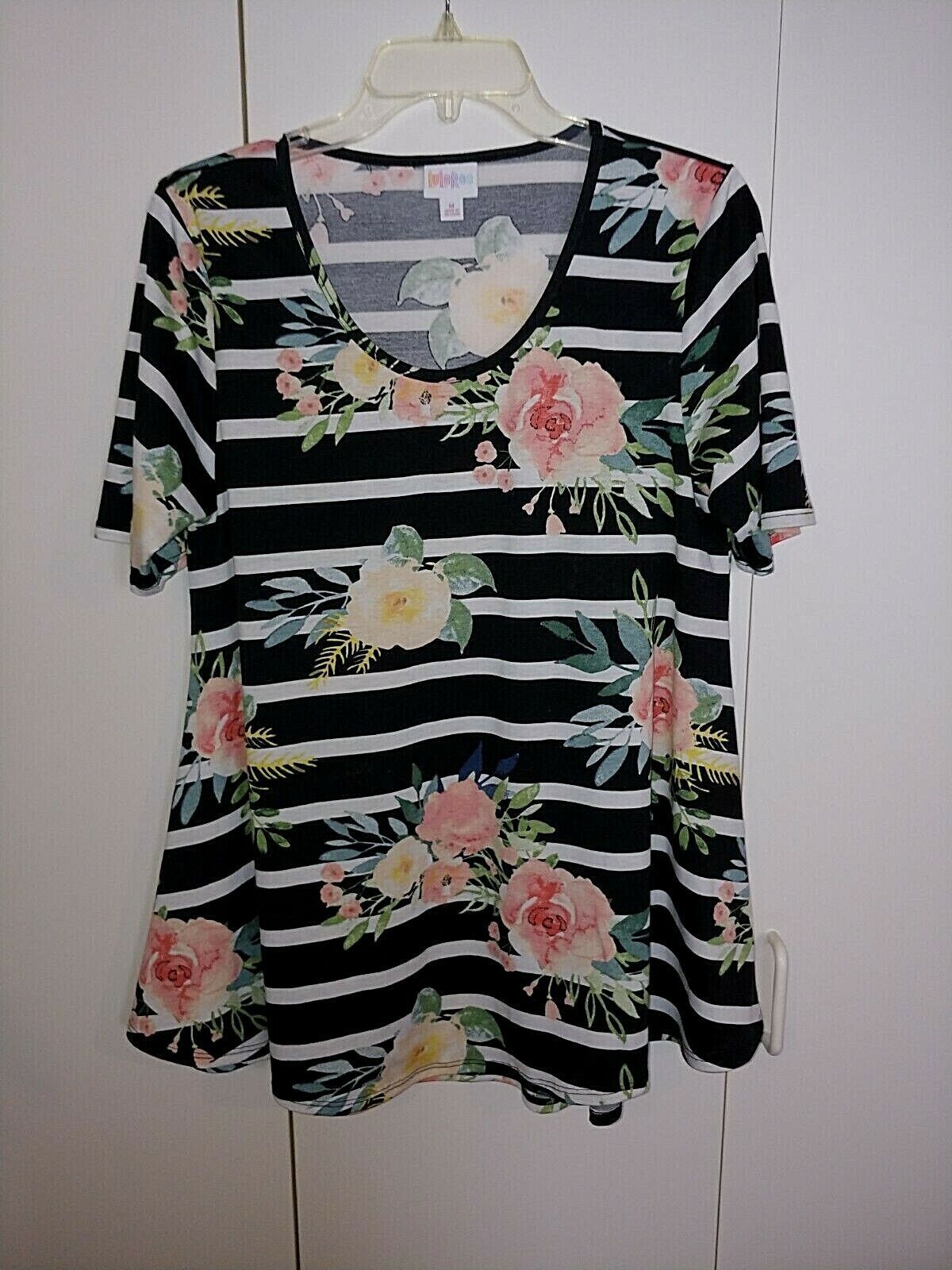 THIS IS A GREAT LADIES LuLaRoe SHORT-SLEEVED FLORAL STRETCH KNIT PULLOVER TOP IN A SIZE MEDIUM. IT IS IN EXCELLENT, WORN ONCE, CONDITION.