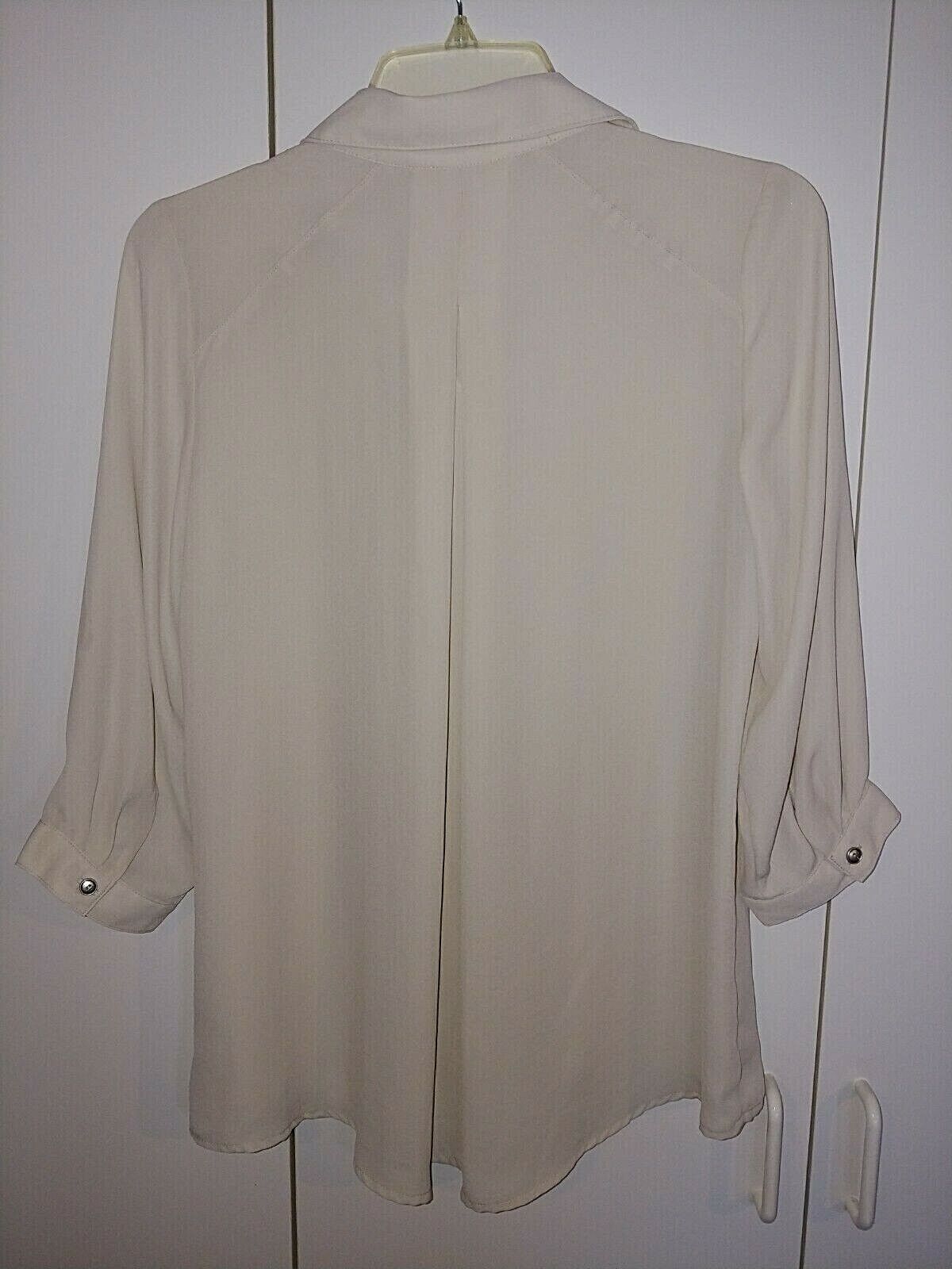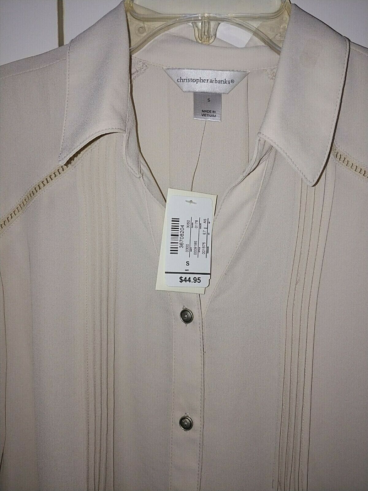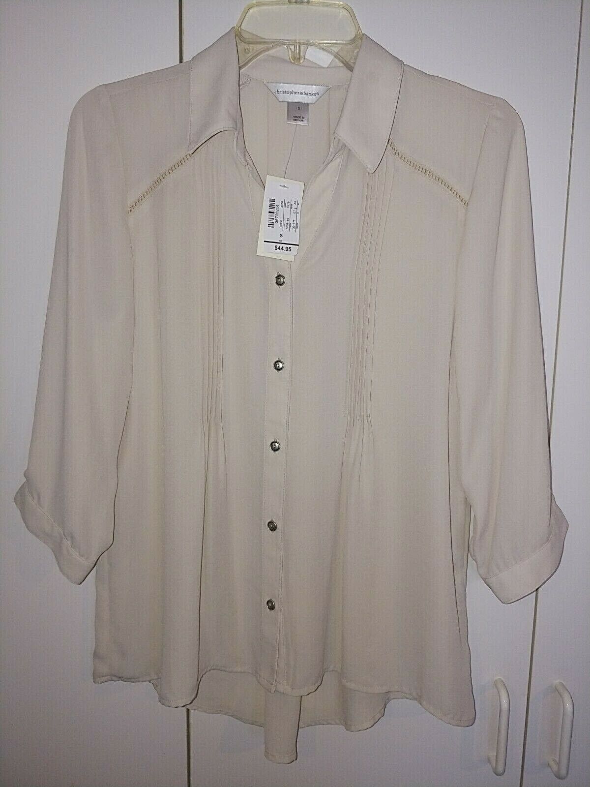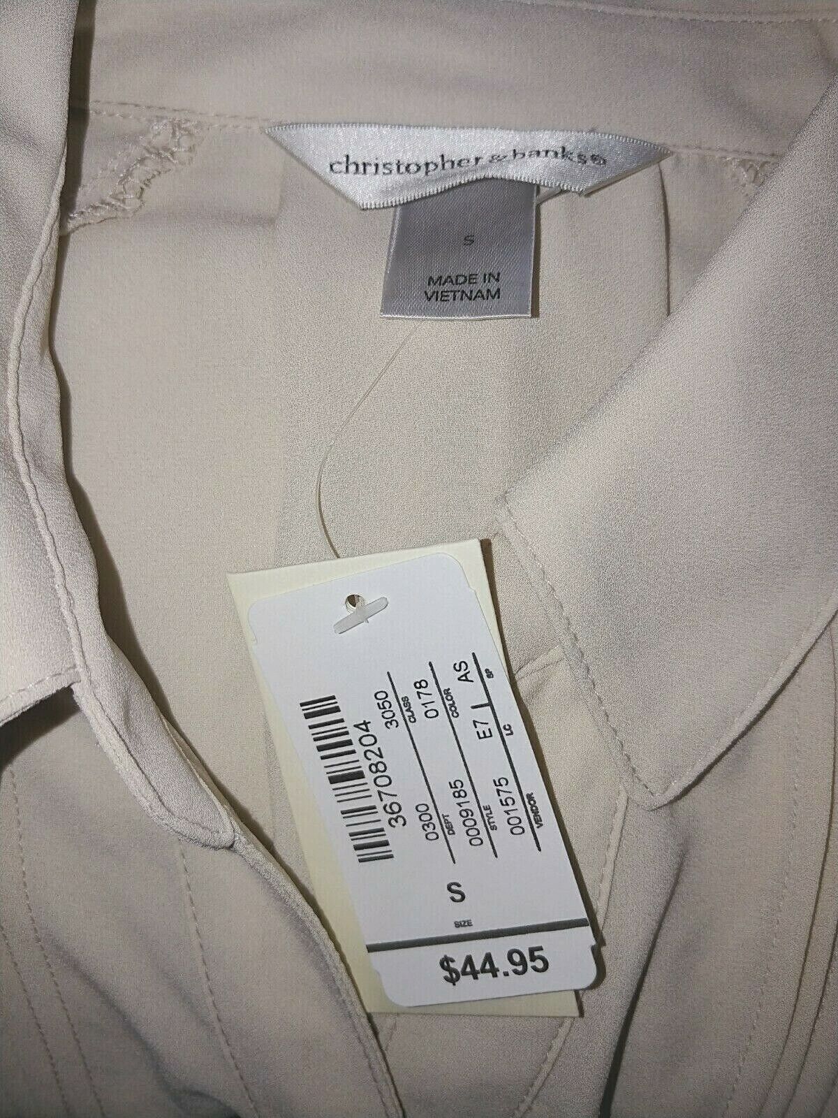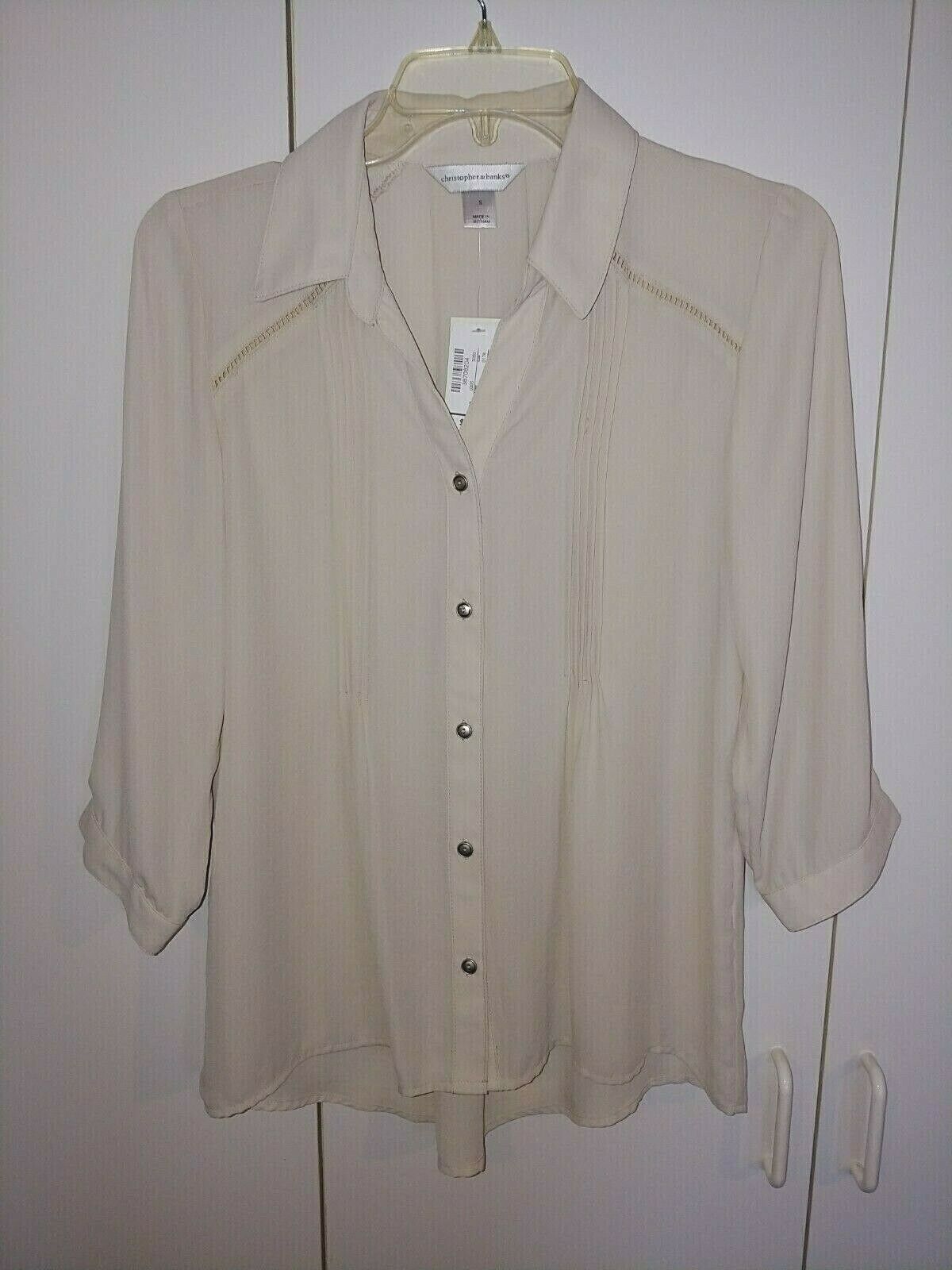 THIS IS A VERY NICE LADIES CHRISTOPHER BANKS 100% POLYESTER 3/4-SLEEVE BEIGE BUTTON BLOUSE IN A SIZE SMALL. IT IS NEW, WITH TAGS ATTACHED AND PRICE TAG OF $44.95.