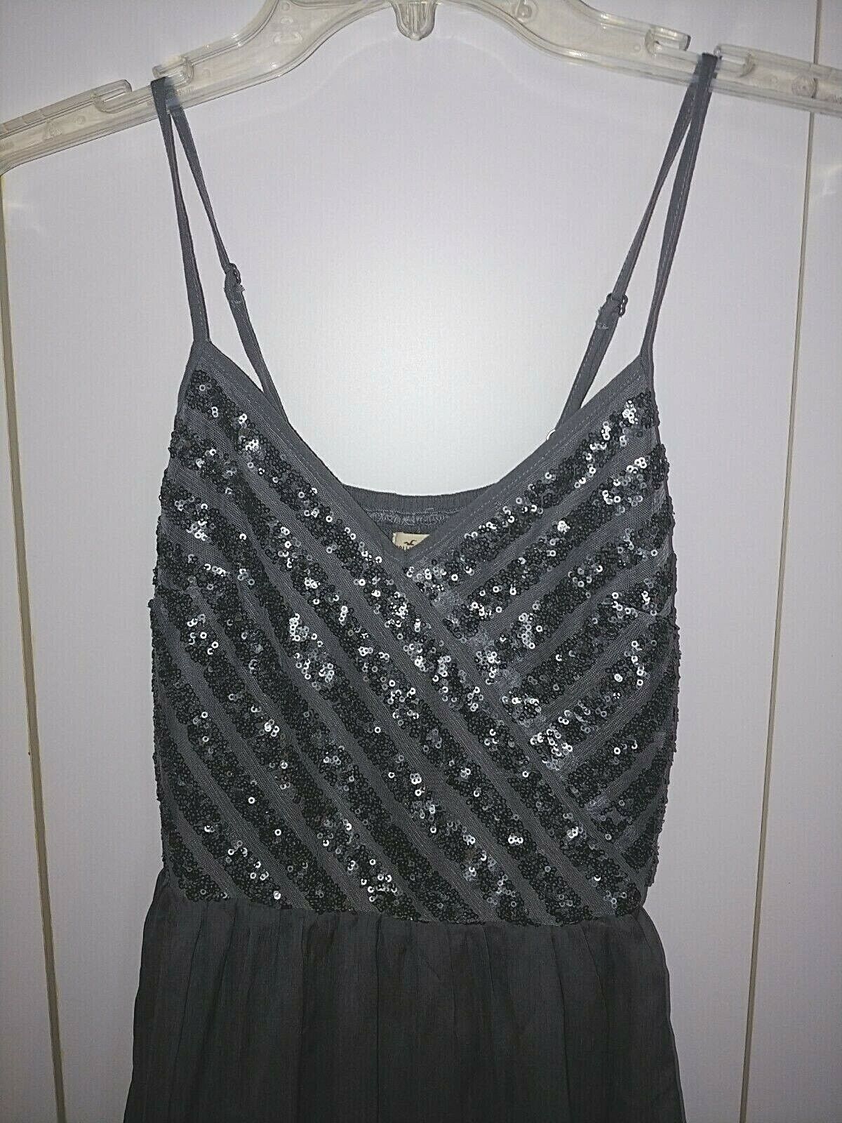 THIS IS AN ADORABLE LADIES HOLLISTER SPAGHETTI-STRAP GRAY PARTY DRESS IN A SIZE JR. XS. IT IS IN EXCELLENT, BARELY WORN, CONDITION.