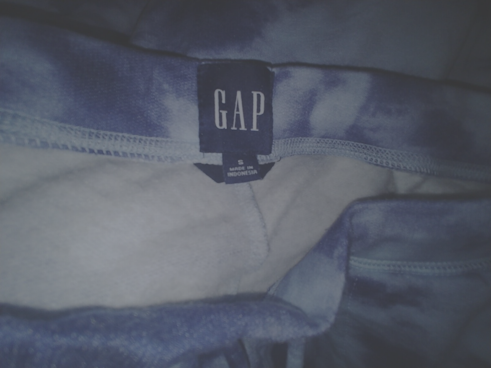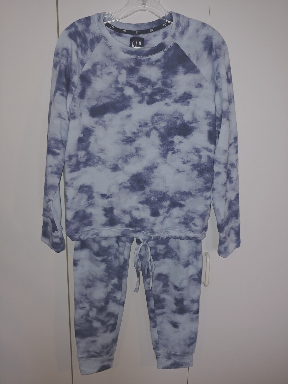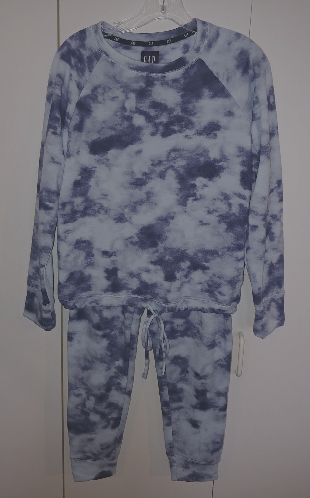 THIS IS A GREAT PAIR OF LADIES GAP BLUE TIE DYED KNIT/FLEECED LINED JOGGER/LOUNGE SET IN A SIZE MEDIUM. IT IS IN EXCELLENT, BARELY WORN, CONDITION.