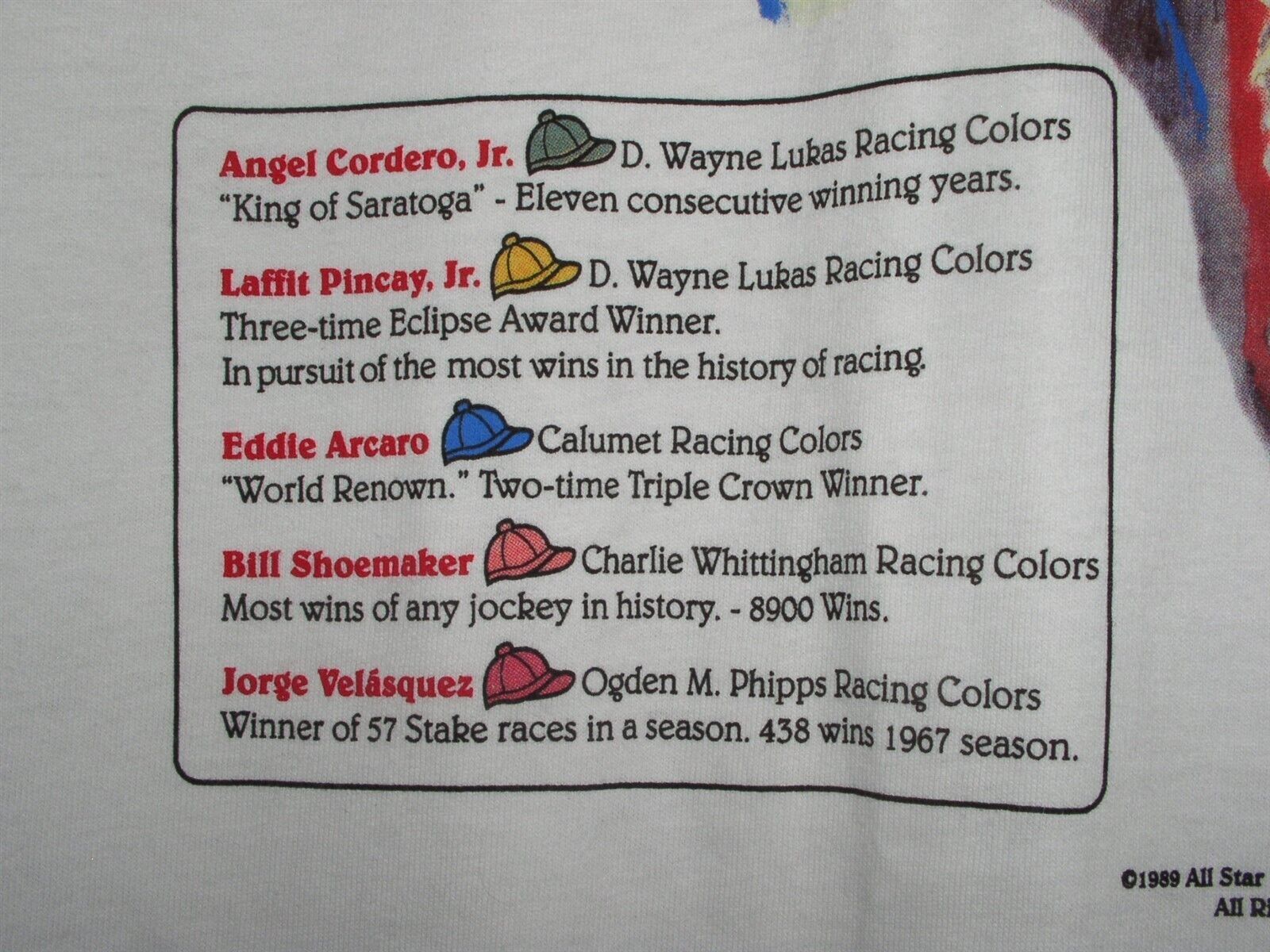 This is a vintage concert tour t shirt entitled, "The Legends" Angel Cordero, Jr., Laffit Pincay, Jr., Eddie Arcaro, Bill Shoemaker, Jorge Valasquez. Dated 1989 All Star Events, Promotions, Inc. Tag reads: Fruit of the Loom Heavy Cotton. There is no back printing. Shirt sleeves are single-stitched, hem is double-stitched to establish its vintage. A terrific item for the fan or collector.