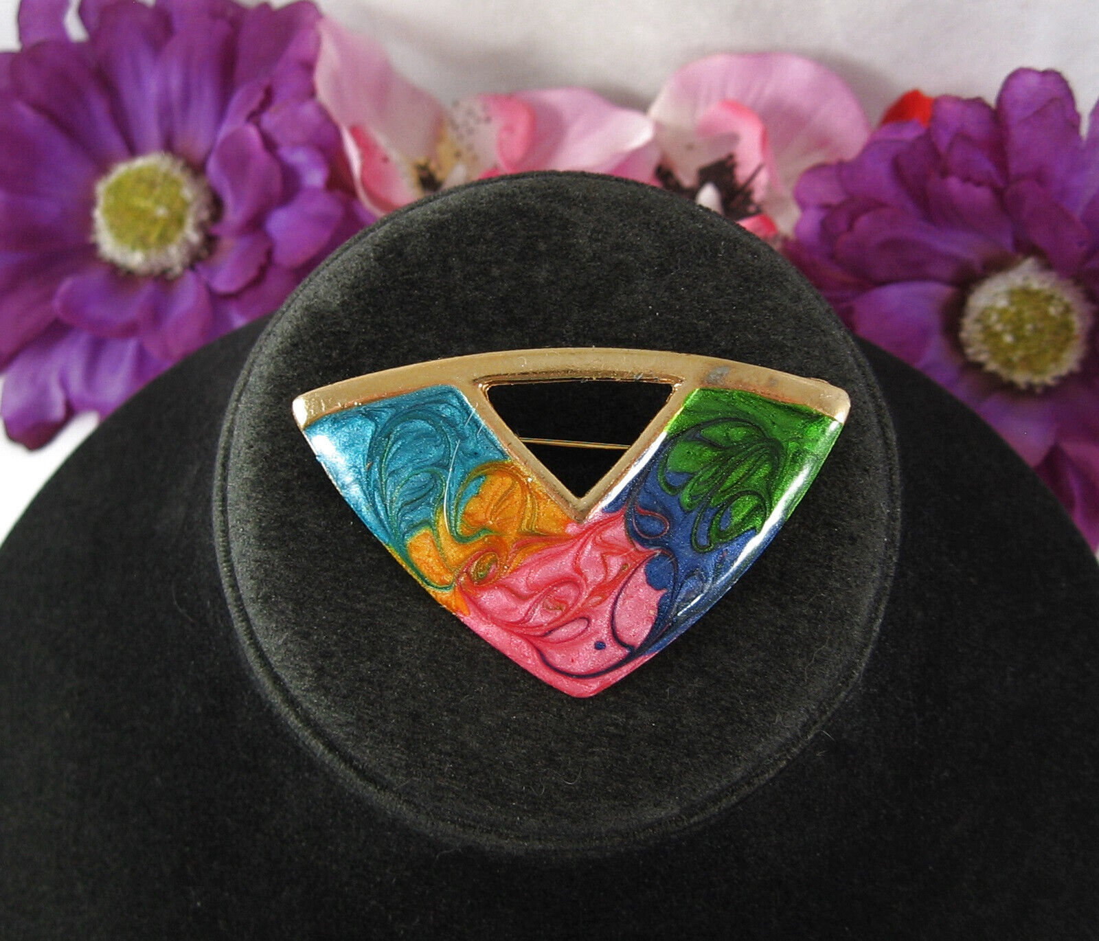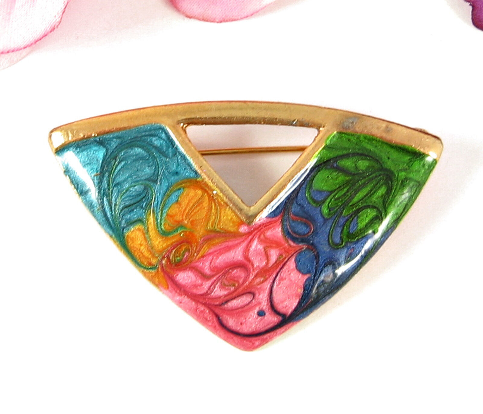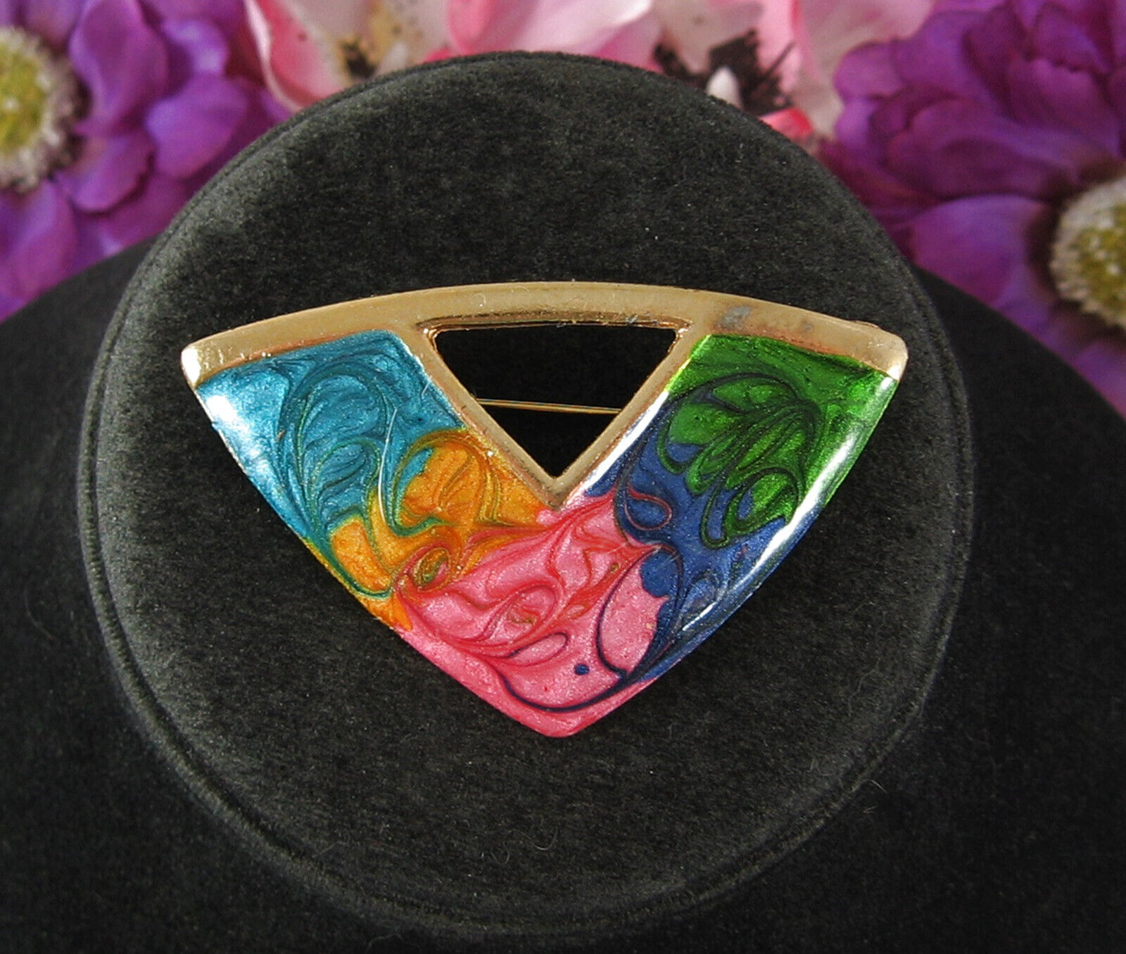 The Brooch is triangle shaped and worn with a point down and an open triangle cut out center top! The enamels are a shimmery swirl of turquoise-blue, yellow, pink, dark blue and green!