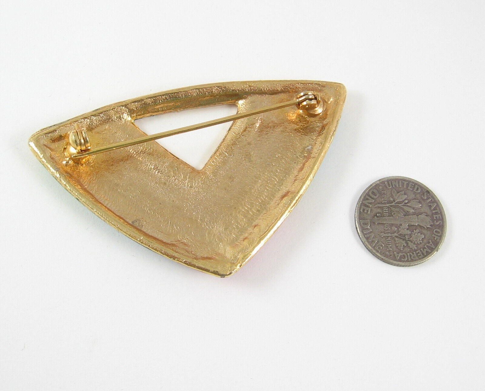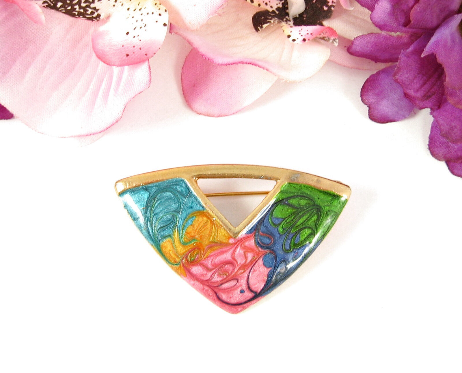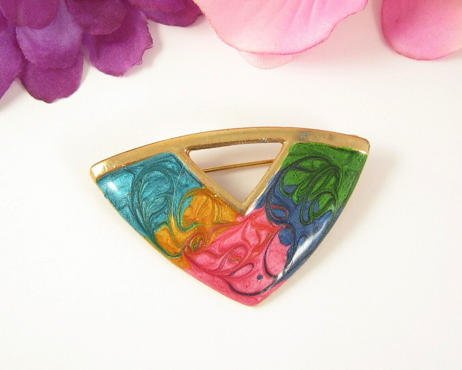 The Brooch is triangle shaped and worn with a point down and an open triangle cut out center top! The enamels are a shimmery swirl of turquoise-blue, yellow, pink, dark blue and green!