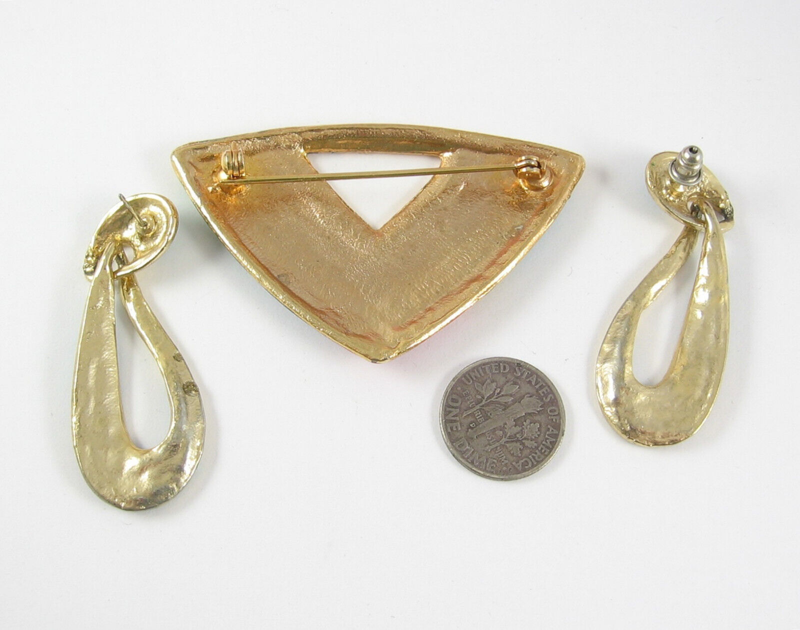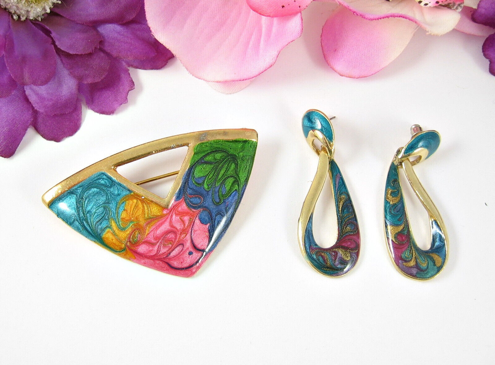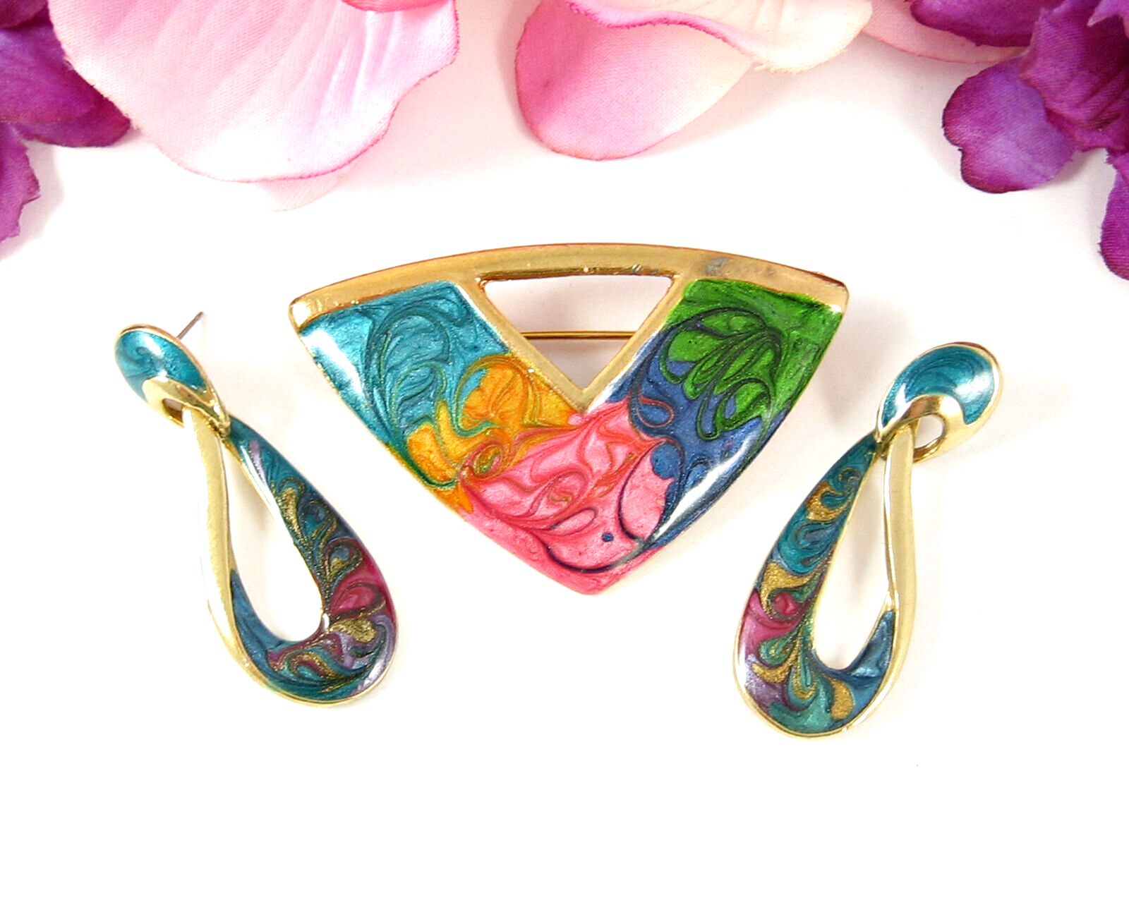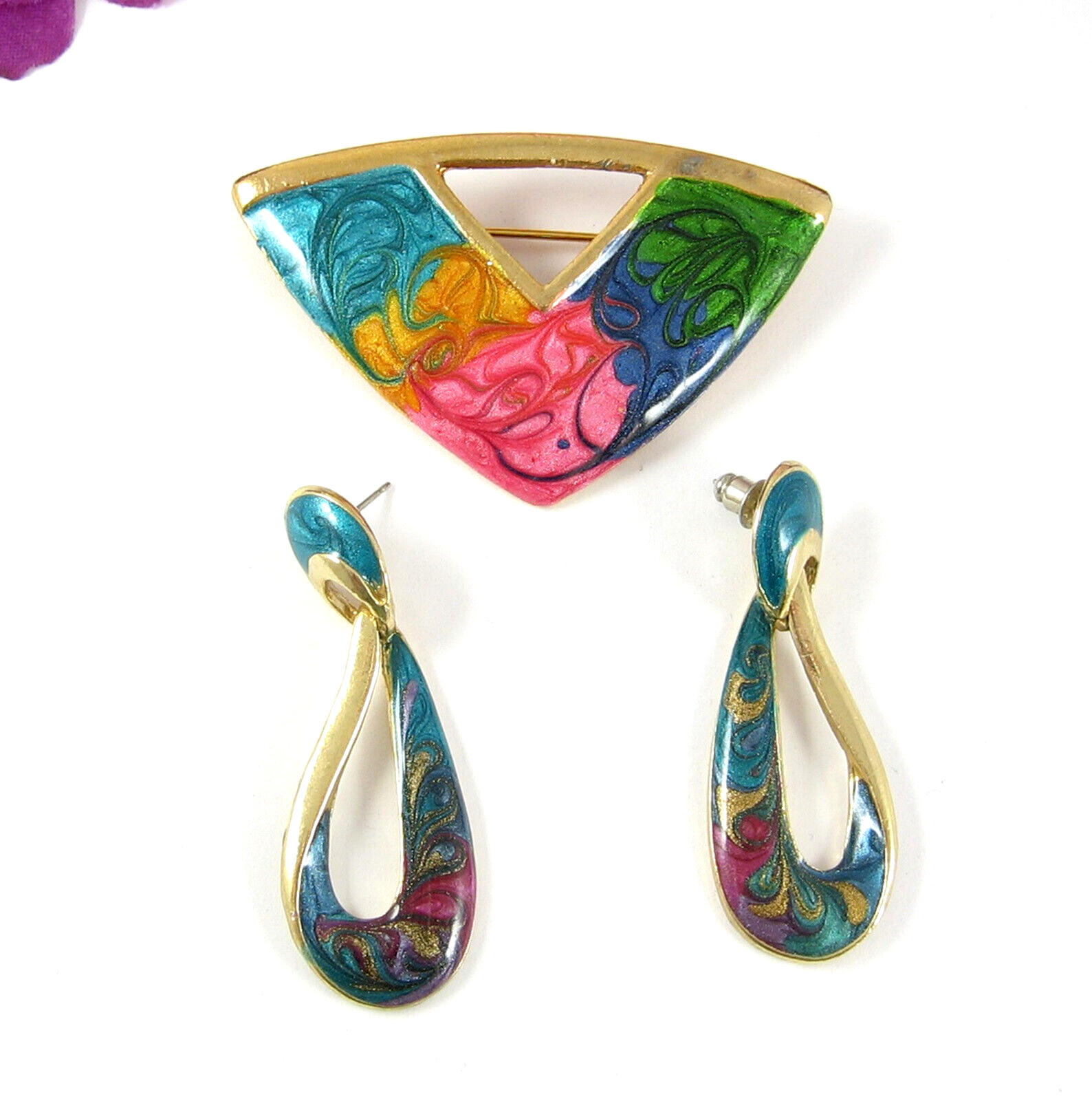 In a goldtone metal this is a vintage TRIANGLE PIN and TEARDROP EARRINGS in a Rainbow of Colored Enamels!