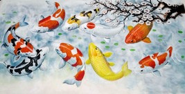 This fantastic oil painting depicts a group of colorful koi fish swimming in a pond with a blooming cherry blossom tree in the background.
