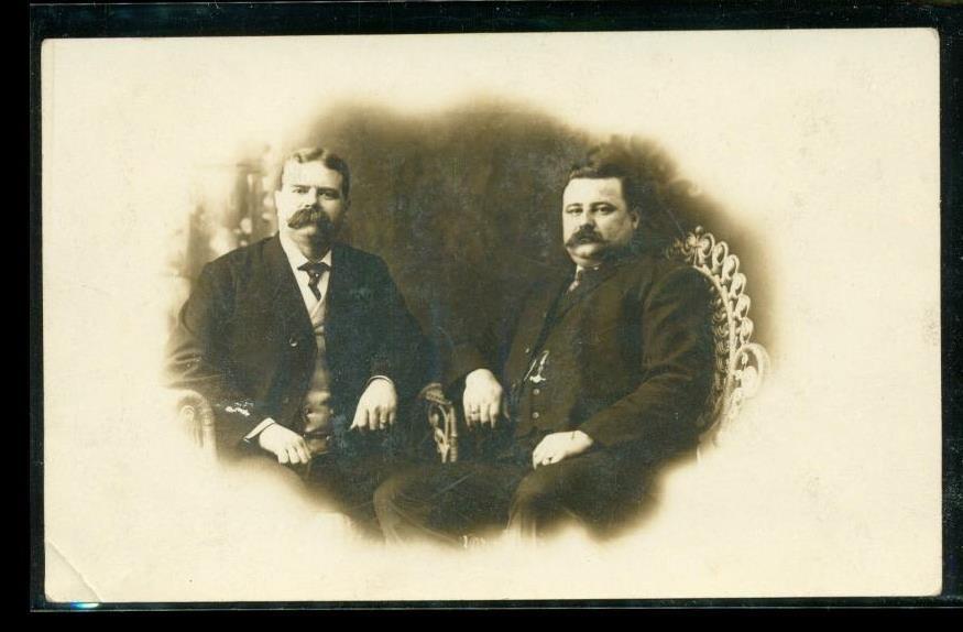 Vintage 1900s Postcard RPPC Real Photo Men Shaggy Walrus Handlebar Mustaches. Two men in wicker chairs early 1900s.