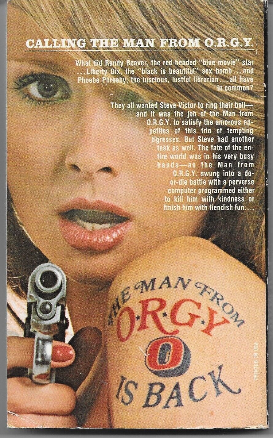 Ted Mark penned the ?Man from O. R. G. Y.? series of thriller spy novels. The series featured fifteen books in total, starting publication in the year 1965, when ?The Man from O. R. G. Y.? was released. Steve Victor?s a guy that studies sex from all angles, both right-side-up and upside-down. Not only does he study it, he loves it and that makes the research he does that much more fun. He is the one-man organization called O. R. G. Y. It stands for, according to Steve, the Organization for the Rational Guidance of Youth. He calls it that because having a name that indicated the real purpose of studying sex would most likely get way too many doors slammed close in his face. For Victor, the open doors meant a lot more opportunities for cash and the true meaning of Obtaining Research Grants for Yours truly. Even though Victor admits freely that he works hard for grant money to continue his wonderful lifestyle, grants aren?t his sole source of income. While traveling the world, he also does some odd jobs here and there for some ?most secret of American spy organization?. This unnamed agency, which for sure isn?t the CIA, may send him off to different action spots in the world however it?s his lust that makes the spots get their activity.