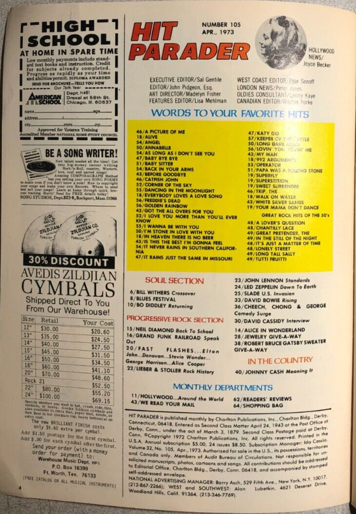 HIT PARADER rock 'n' roll magazine April 1973 (4 pages missing)