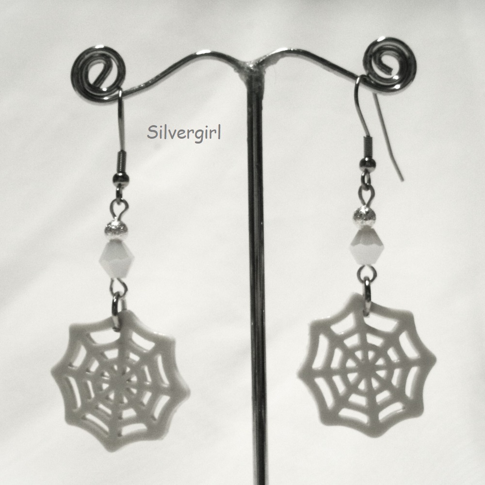This is a pair of lovingly crafted 2 1/2" earrings made with 2" plastic Spider webs They are a very light grey or off white. 4mm swarovski crystal bicones in white opal. I have used silver plated rings and stainless steel earring hooks.