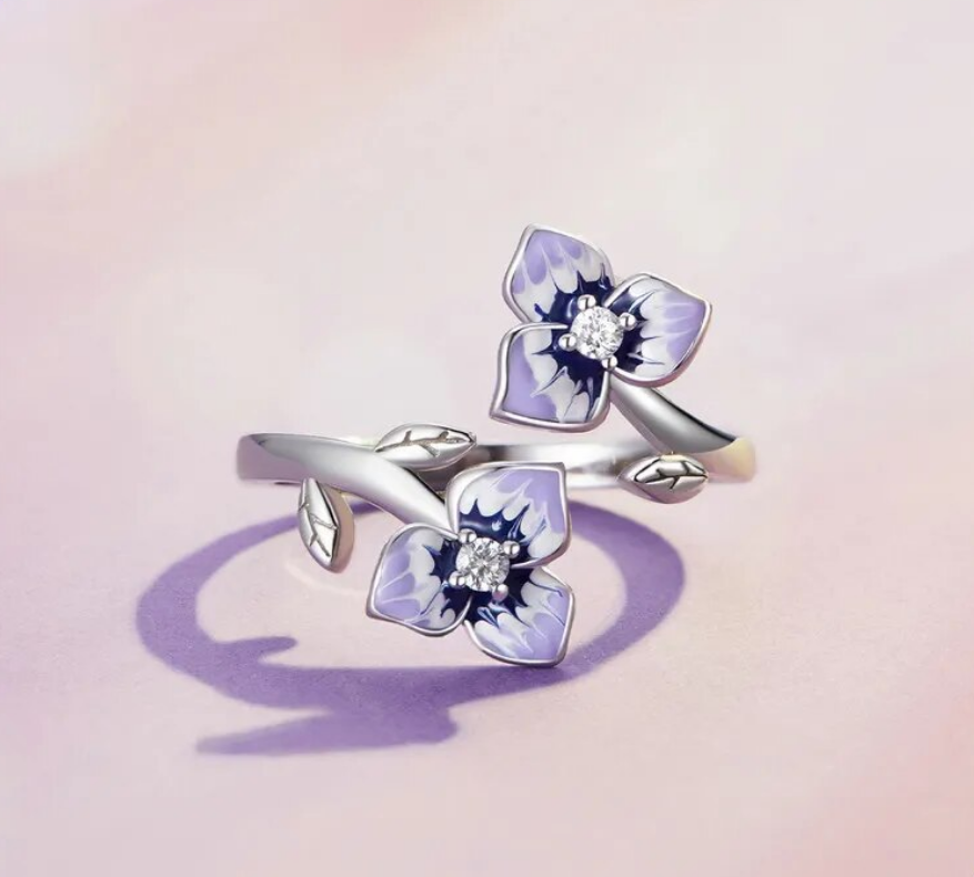 Platinum 925 Sterling Silver Purple Trillium Flower Adjustable Ring (Size 6-8)