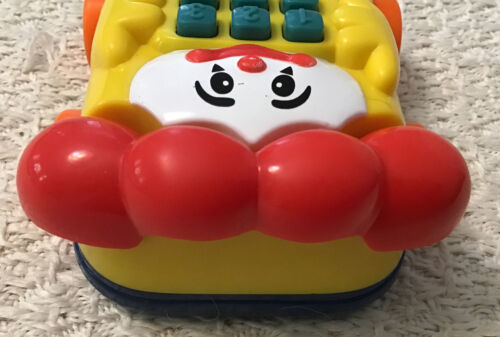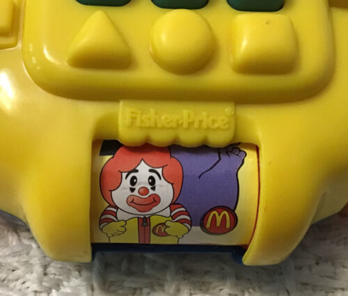 Fisher Price / Mattel Ronald McDonald toy phone. Year: 2003. Wheels that actually roll. Tumbler shows various characters - Ronald, Hamburglar, Grimace, and a family of Chicken McNuggets. Press the phone buttons and watch Ronald's red hair rise and fall. Hard to find item!