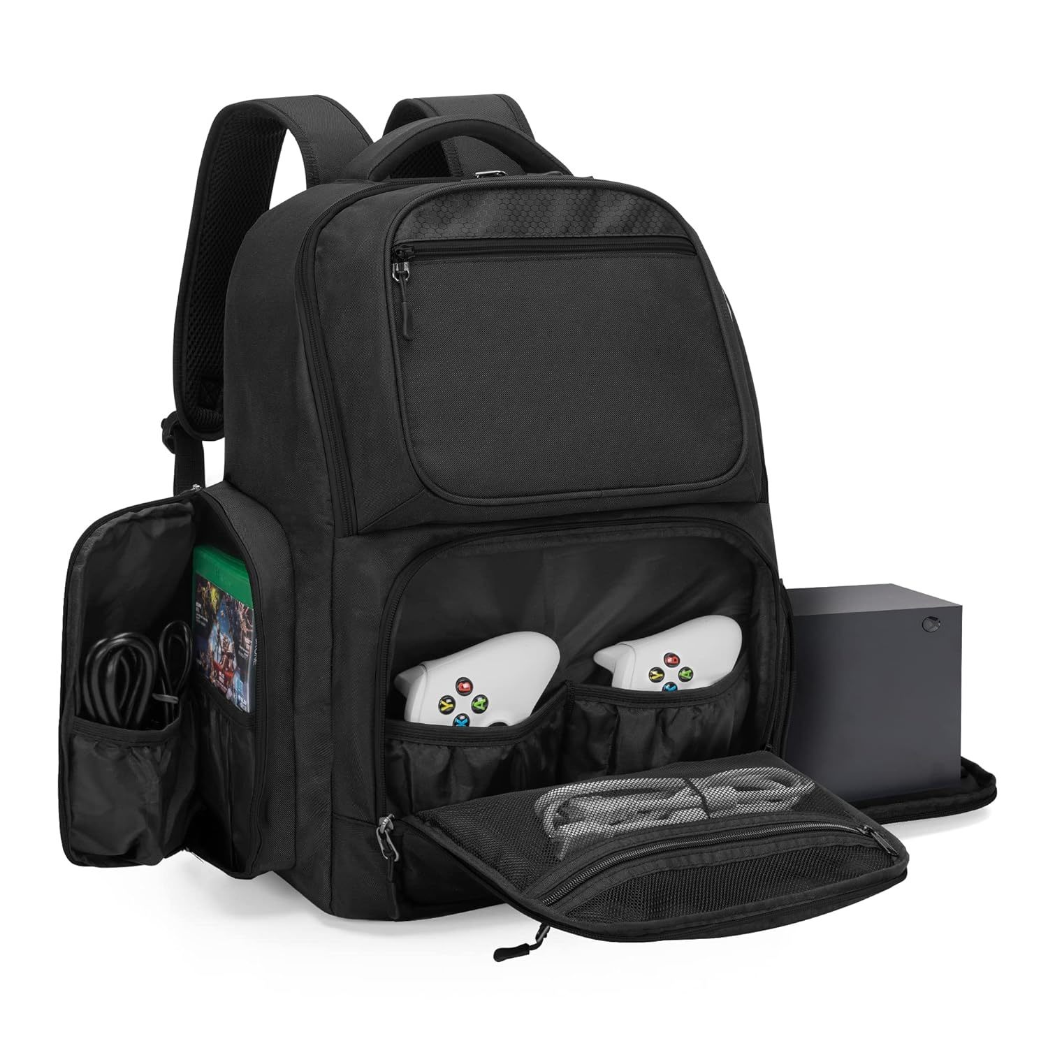 ?Outstanding Design? The main compartment is devided to 2 rooms. When it's horizontal, you can put the console in or out from the side zipper opening and keep the upper part stable. ?Multi-pocket Game Organizer Bag? The upper and lower of the exterior have a zipper pocket, and the lower front pocket with 2 elastic pockets and a mesh pouch, side pockets, for game controllers, headphones, game discs, etc. Besides, the interior has a sleeve for 15.6? laptop. ?Premium Quality? Made of heavy-duty, scratch tear-resistant nylon for long-lasting performance. Padded PE foam lining can stop your console and accessories from bumping, and provide excellent protection. ?Travel Friendly? This backpack is equipped with a padded handle and adjustable ergonomic padded shoulder straps, which can reduce fatigue during carrying. Extensive breathable padding on the waist also makes your journey easier and more comfortable. ?Wonderful Gift? Dimension: 14.1?*6.7?*17.6?. The travel carrying backpack is especially compatible with the Xbox Series X console, ideal for game enthusiasts or those who regularly go to gaming parties. Just bring your favorite game in the bag for an exciting time.