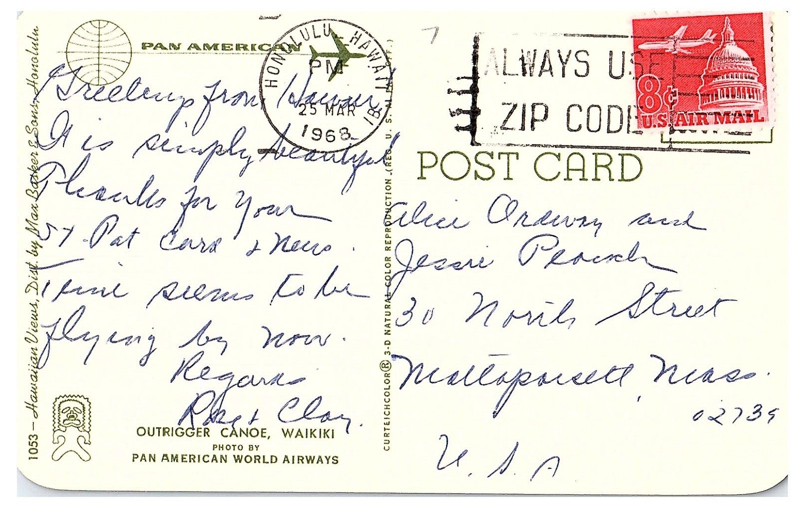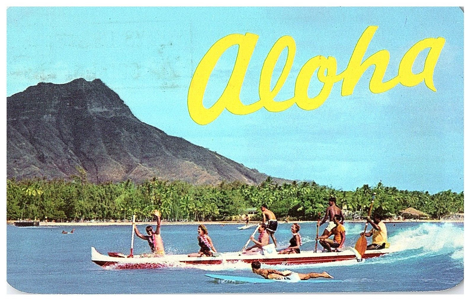Aloha Pan American Airways Surfing Outrigger Canoe Hawaii Postcard 1968