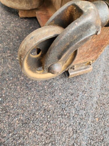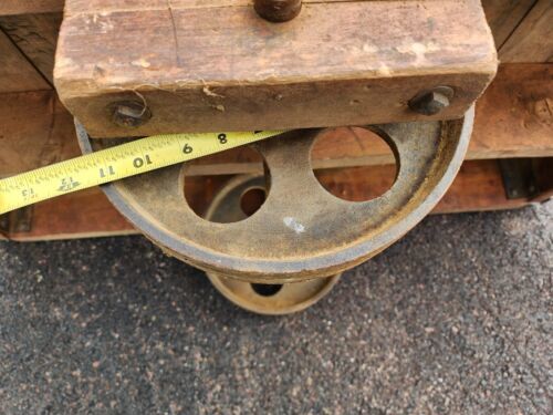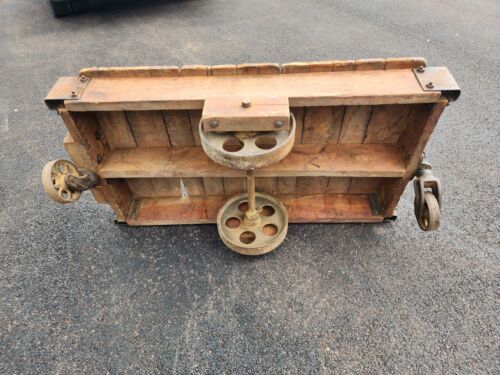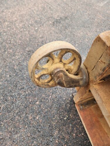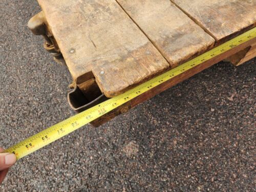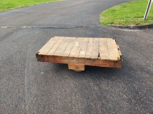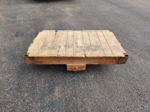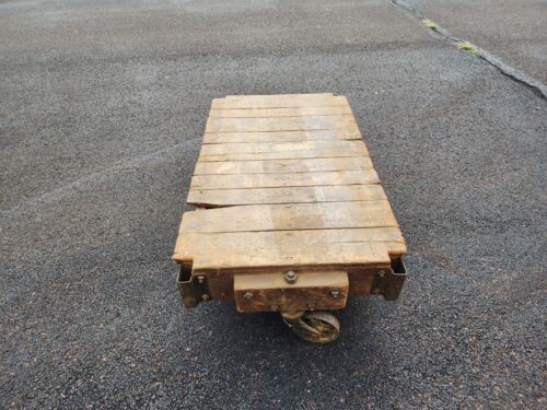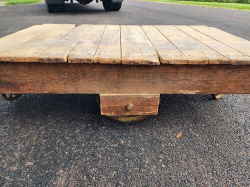 Vintage / Antique Fisher Kurt Co. Factory Cart Original Cast Iron Wheels. The deck measures around 47-3/4" L x 28" W overall length is around 50"+ pocket to pocket the cart stands 14" tall. This cart is in decent condition for its age and would not take much to make a coffee table or something else or it could still be used as a cart.