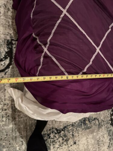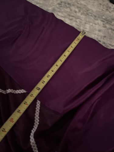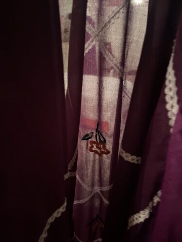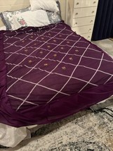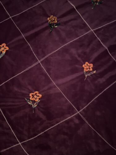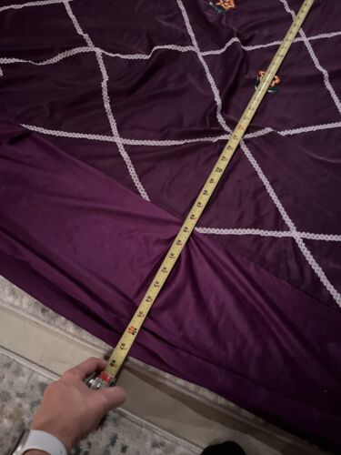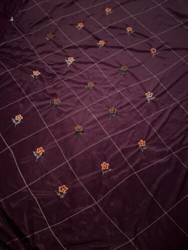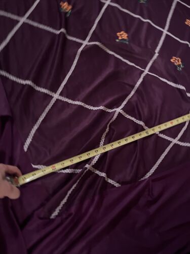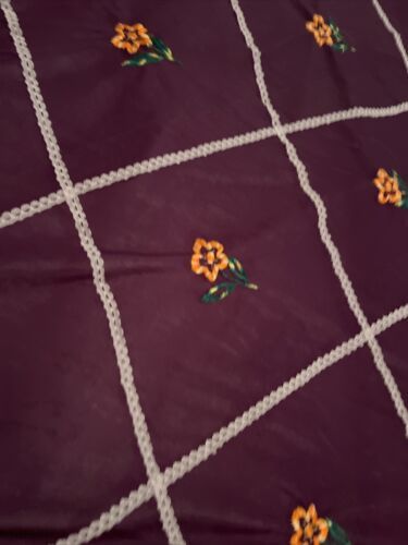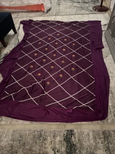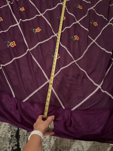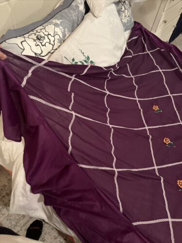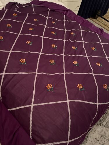 Deep purple, sheer coverlet that I believe fits on a full size bed. No holes, or stains. Flowers are orange. See pictures for measurements please. Pictures are showing this on a queen size bed. This might be handmade.